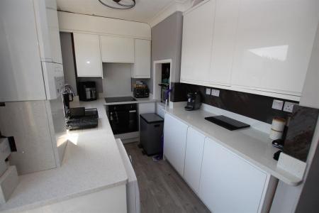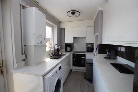 Double glazed window to rear, single sink set in stone worksurfaces with range of matching base and eye level units, built in oven, hob and integrated extractor over and space for washing machine.