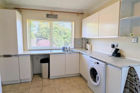 Fitted with white laminated fronted units comprising of rolled edge work tops with cupboards and storage below, matching eye level cupboards and tall cupboard, tiled floor, radiator, inset single drainer sink unit, internal door to garage, double glazed rear window, door to
