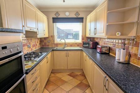 Fitted with a range of wood effect panelled fronted units comprising of laminated rolled edge work tops with cupboards and drawers below, matching eye level cupboards, tiled splash backs, inset single drainer one and a quarter bowl sink unit with mixer tap, fitted 5 ring gas hon with concealed extractor hood over, fitted double oven, integrated fridge and dishwasher, double glazed front and side windows.