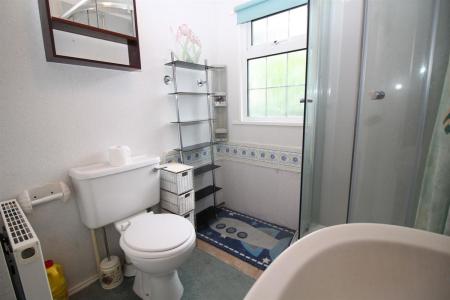 White suite with shower cubicle, pedestal wash hand basin, low level WC, radiator, double glazed rear window