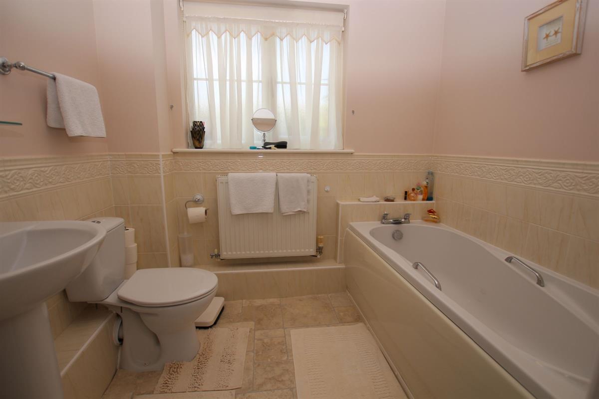 Panelled enclosed bath, pedestal wash hand basin, low level W.C, half tiled walls, double glazed window to front, skimmed ceiling and extractor fan.