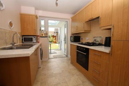 Modern fitted comprising of single drainer sink unit set in square edge work surfaces with range of matching base and eye level units, built in oven and hob with integrated extractor fan, space for washing machine, wall mounted boiler in matching cupboard, skimmed ceiling, double glazed French doors to
