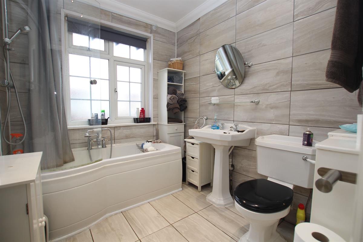 White bathroom suite comprising of panel enclosed shower bath with shower screen and shower attachment, low level W.C, pedestal wash hand basin, double glazed window to front, three walls fully tiled, tiled floor.
