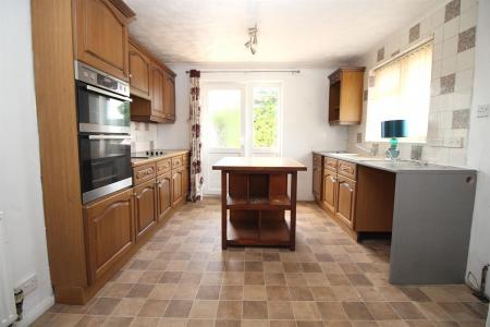 Fitted and comprising of one and a quarter bowl sink unit, range of matching base and eye level units with roll top work surfaces, fitted eye level double oven unit, inset electric hob with extractor unit above, tiled splashbacks, double glazed window to side, double glazed window and door to rear garden, further door to