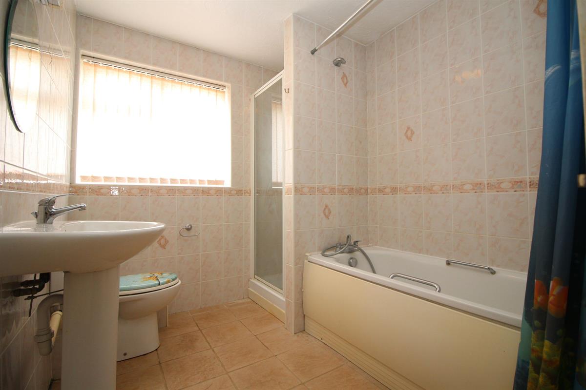 Obscure double glazed window to side, panelled bath with mixer taps and shower over, pedestal wash hand basin, low level W.C, separate shower cubicle with shower over, tiled walls and floor, radiator.