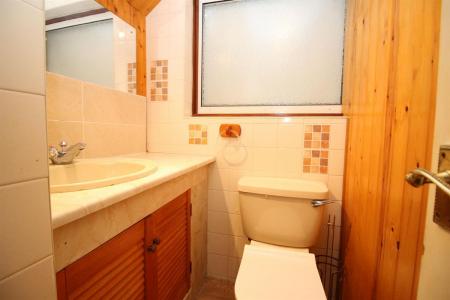 Obscure internal window, inset wash hand basin, low level W.C, part tiled walls, radiator.