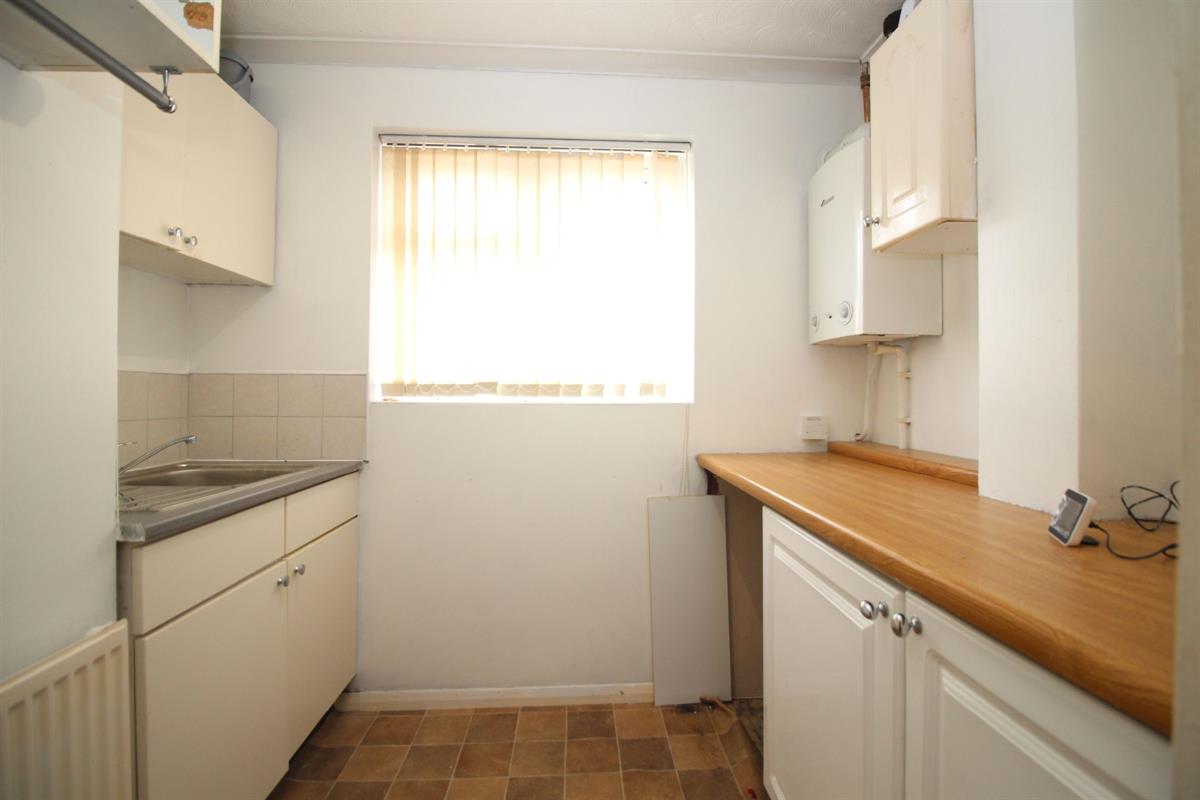 Double glazed window to side, space for domestic appliances, single drainer sink unit set in work surface with base and eye level cupboards, wall mounted gas fired boiler.