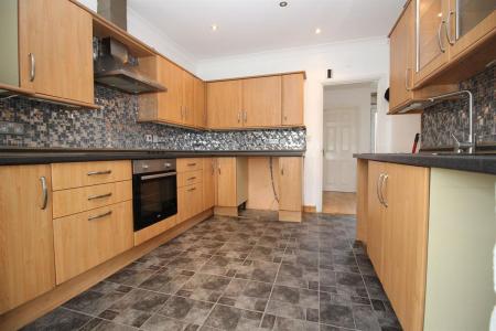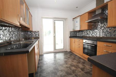 Single drainer one and a half bowl sink unit with mixer taps set in roll edge work surfaces with cupboards under, further roll edge work surfaces with a range of matching base and eye level units, built in oven with hob over and extractor hood, wall mounted boiler, coved and skimmed ceiling with recessed spot lighting, double radiator, double glazed patio doors through to conservatory.
