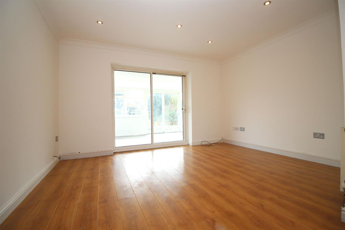 Laminate wood effect flooring, double radiator, coved and skimmed ceiling with recessed spot lighting, double glazed patio doors to