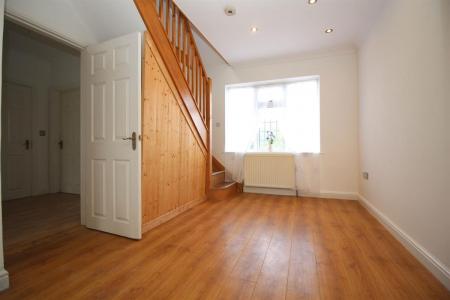 Double glazed window to front, stairs to first floor, double radiator, coved and skimmed ceiling with recessed spot lighting, laminate wood effect flooring, open arch through to