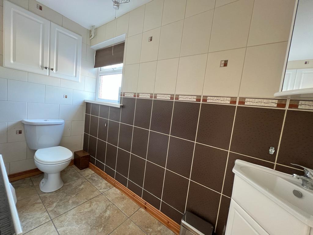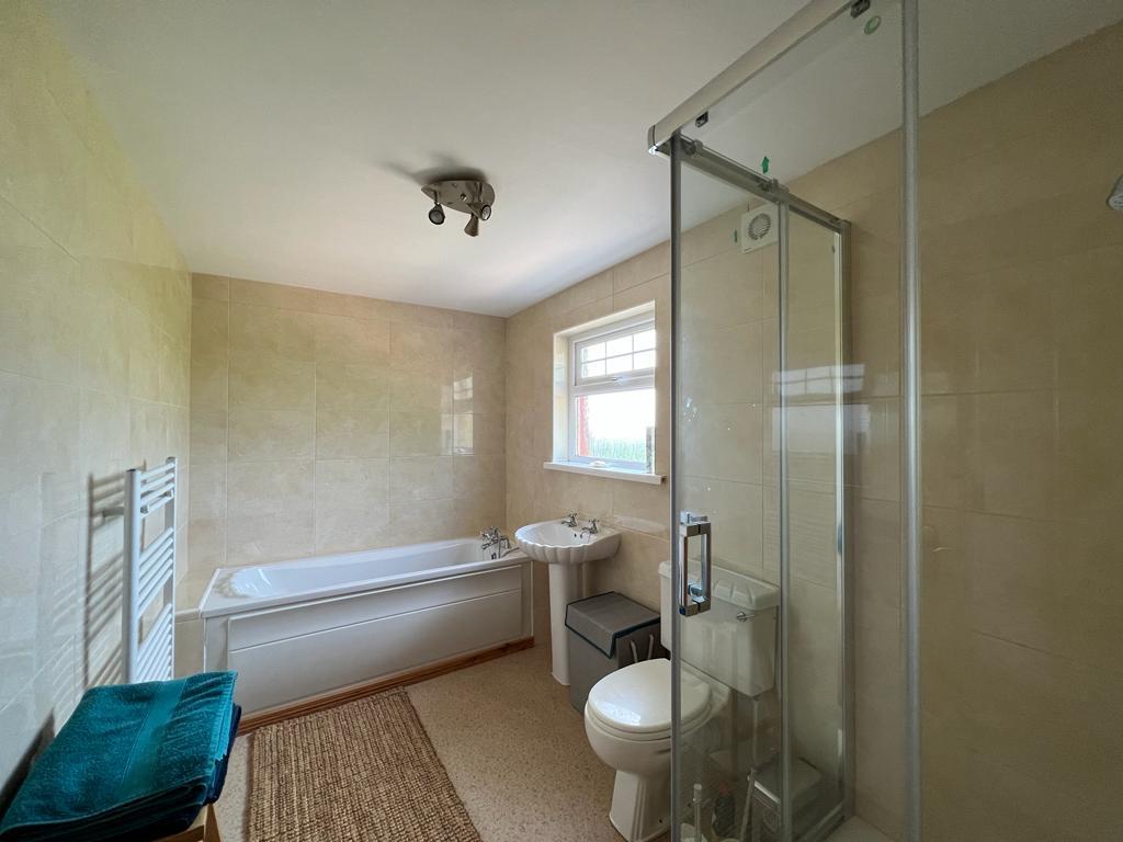 Comprising bath with hand shower attachment to taps, whb and wc, walk in electric shower, fully tiled walls.