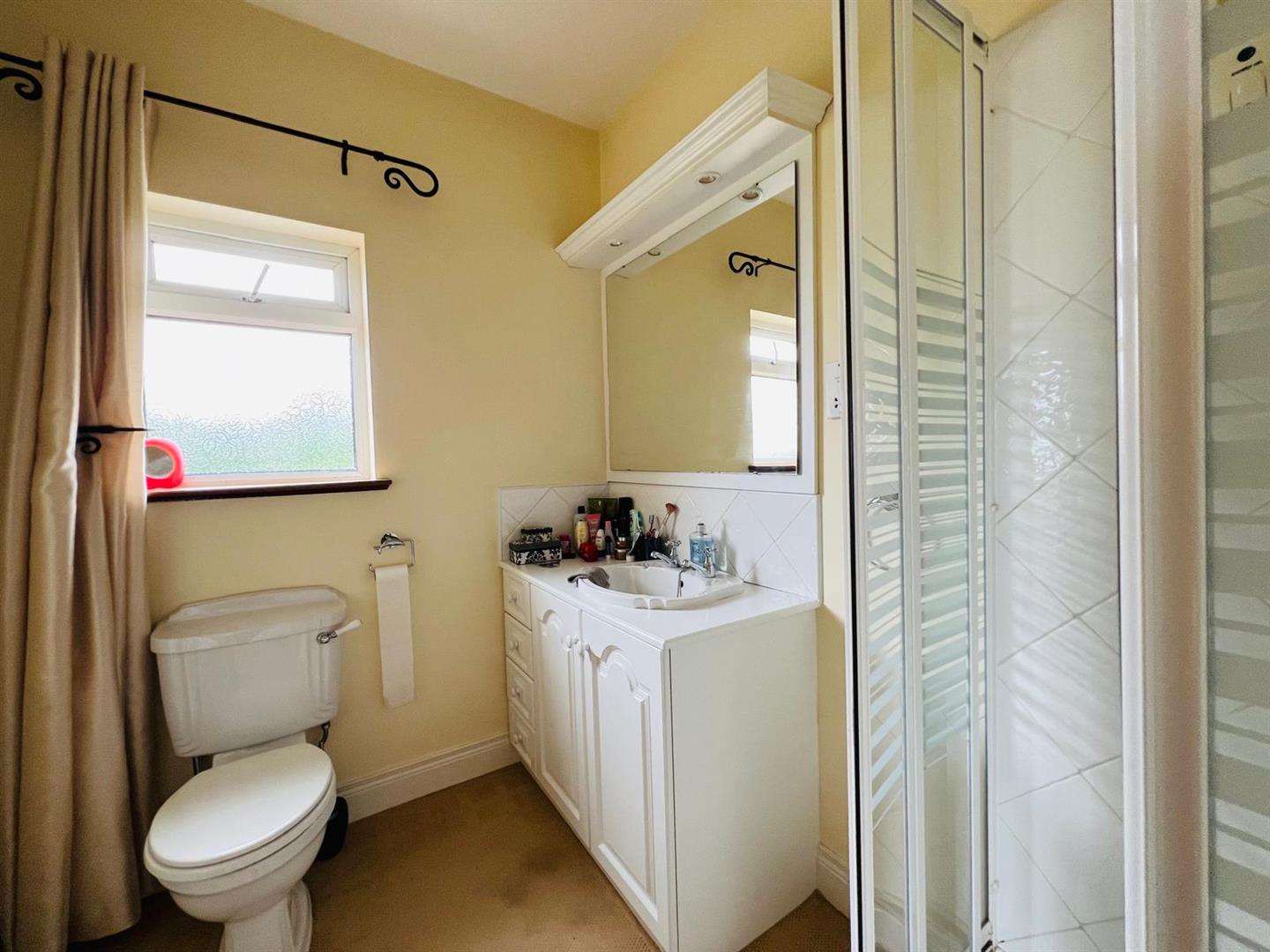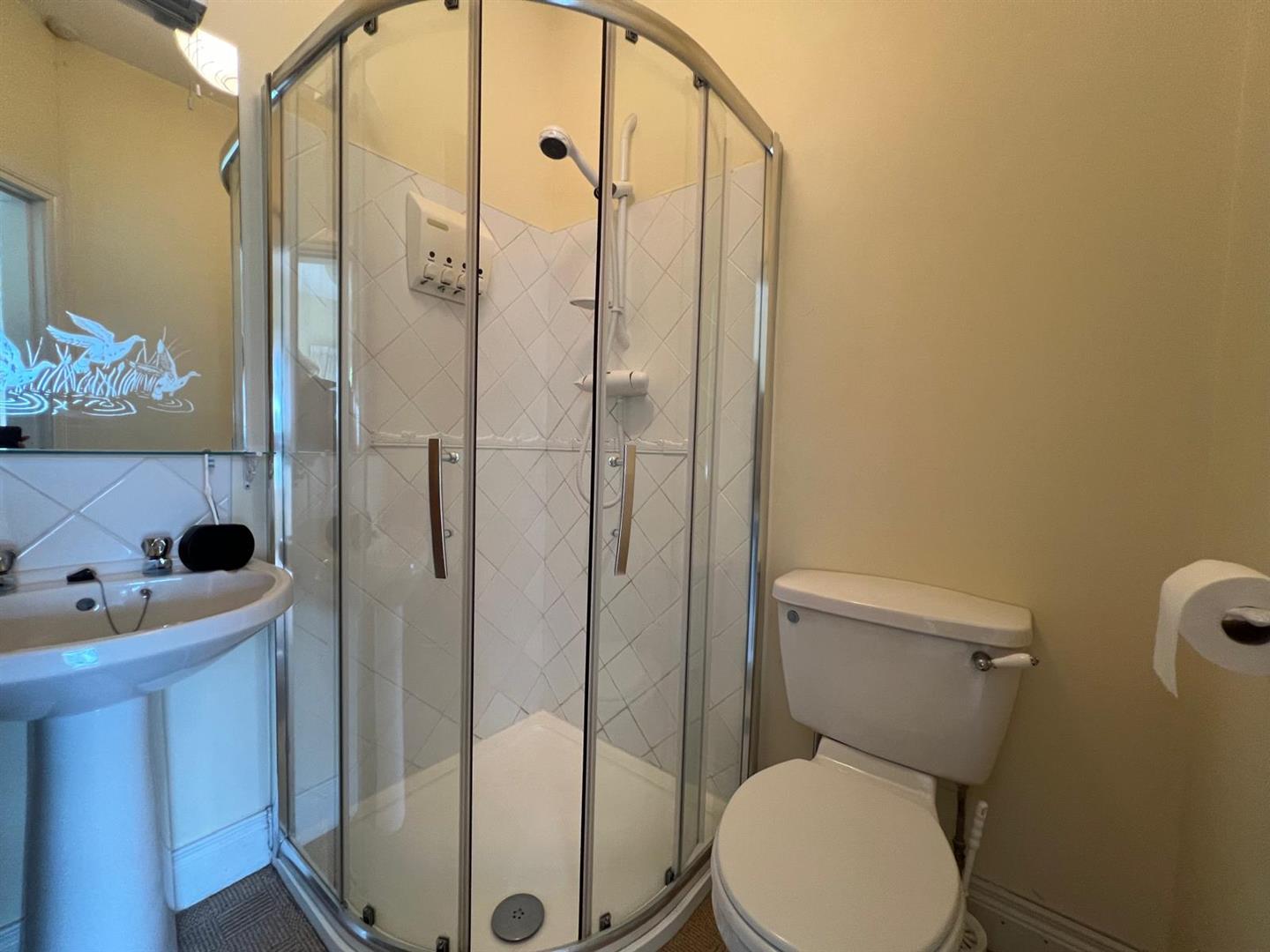 Comprising fully tiled walk in electric shower, whb set in vanity unit, wc.