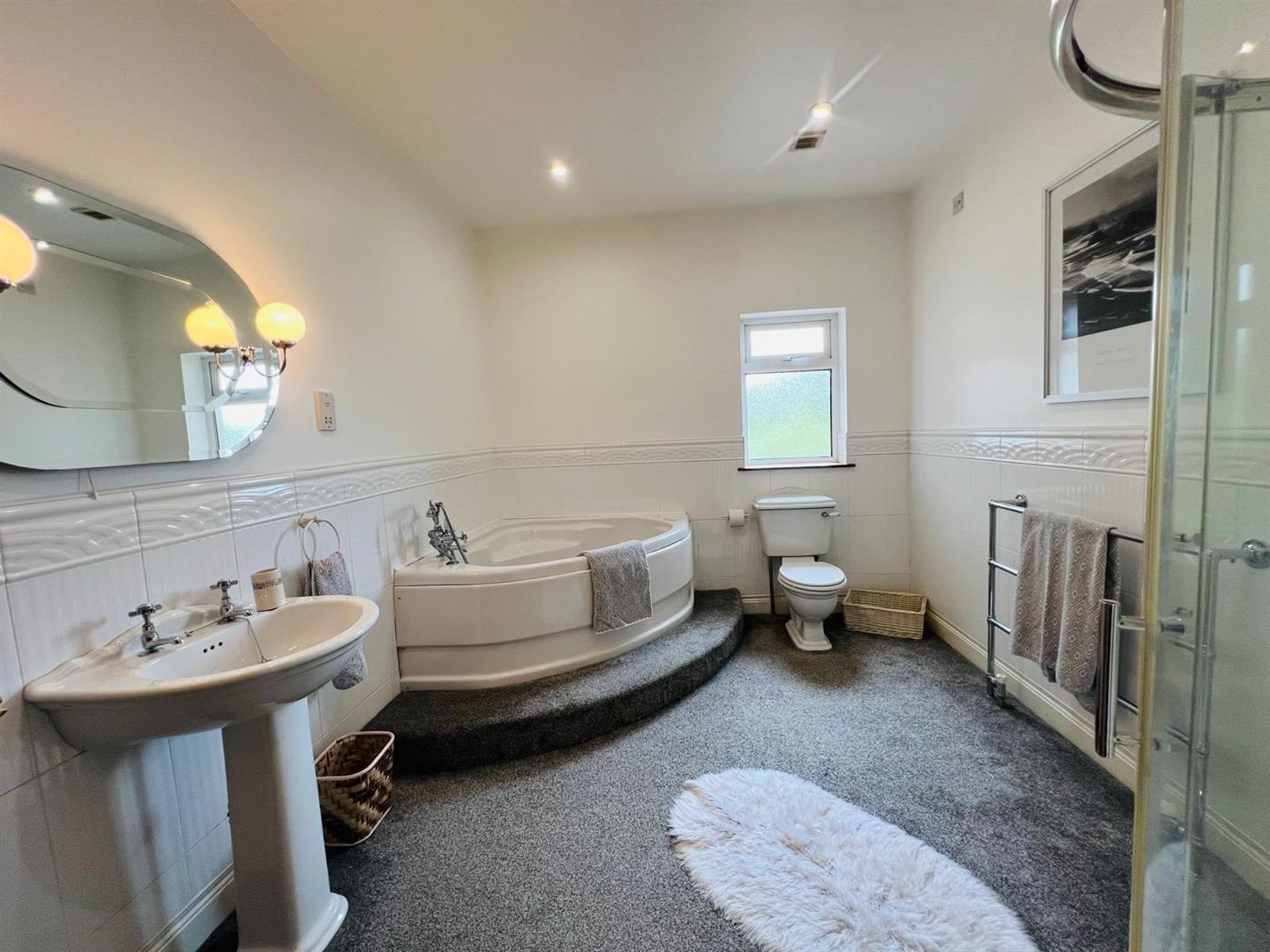 Comprising corner bath with telephone hand shower attachment to taps, fully tiled walk in shower, whb and wc, 1/2 tiled walls, chrome radiator,