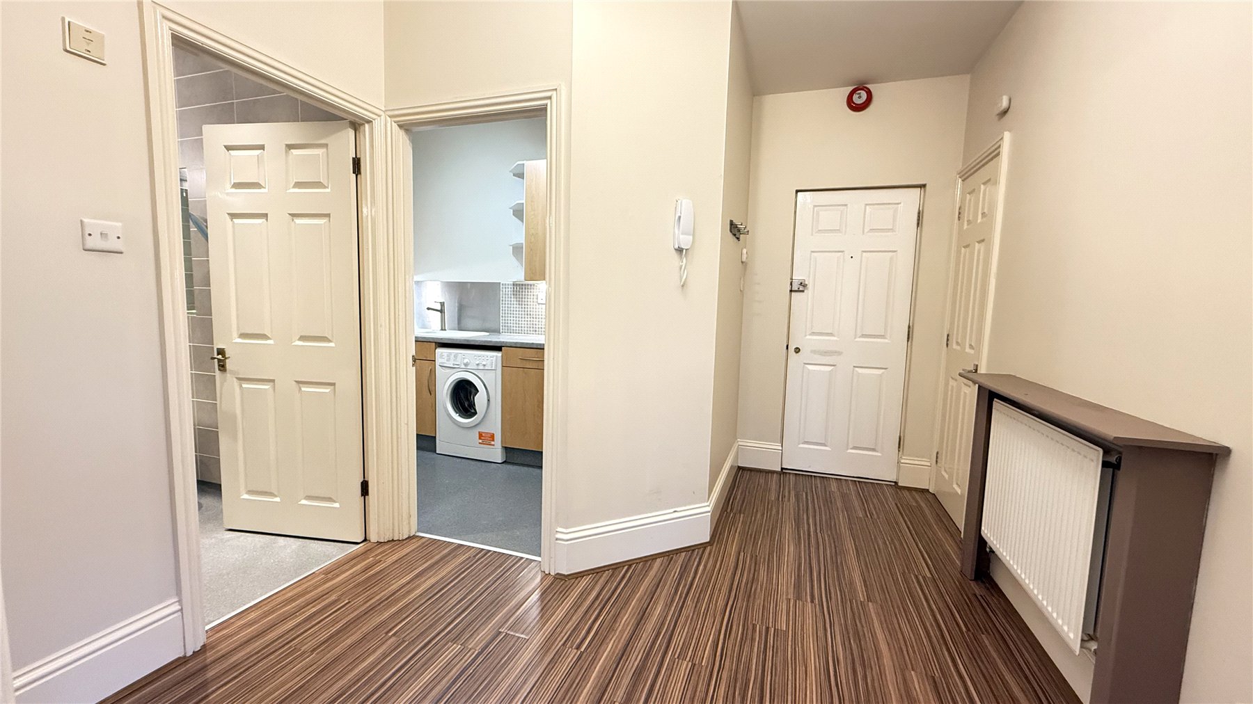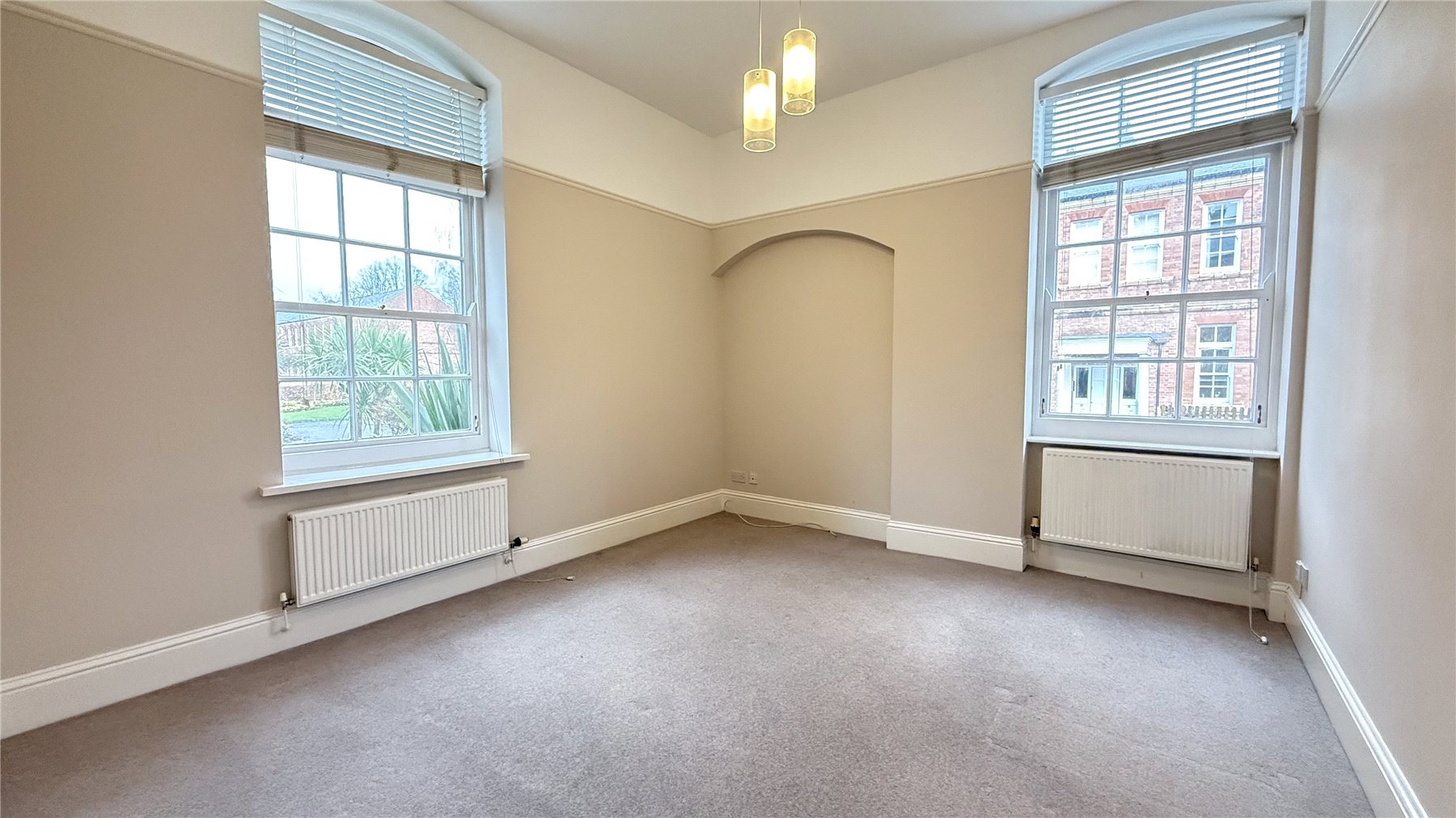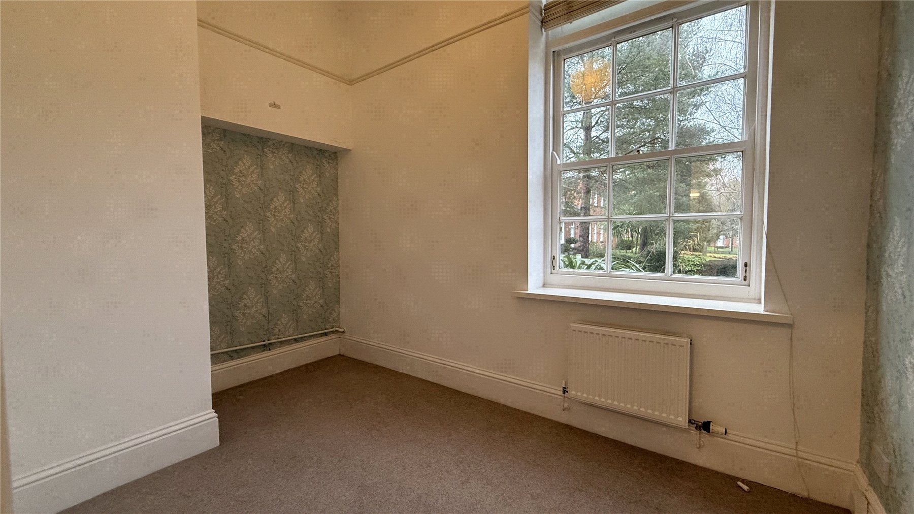 The accommodation is accessed via an entrance hallway and is situated within an attractive grade II listed building. The property comprises a well-appointed kitchen fitted with floor and wall mounted cupboards and drawers, ample work surfaces, and a fully tiled splashback. The sitting room is a bright and spacious double-aspect room with high ceilings, enjoying views over some of the communal grounds, and benefits from two radiators, as well as television and telephone points. The kitchen features a four-ring gas hob with oven beneath, extractor hood and light, an integrated dishwasher, and a washer/dryer with space for a fridge freezer, along with a 1½ bowl sink with mixer tap and radiator. The apartment offers two bedrooms, both enjoying front-facing windows and radiators, with the principal bedroom providing generous proportions. The bathroom is fitted with a bath with shower over, wash hand basin, low-level WC and heated towel rail. Externally, the property benefits from two allocated parking spaces to the front plus access to additional visitors parking area. Externally, the home is set within a sought after development offering well-maintained communal areas and is ideally placed for access to excellent local amenities, transport links, and nearby green spaces.