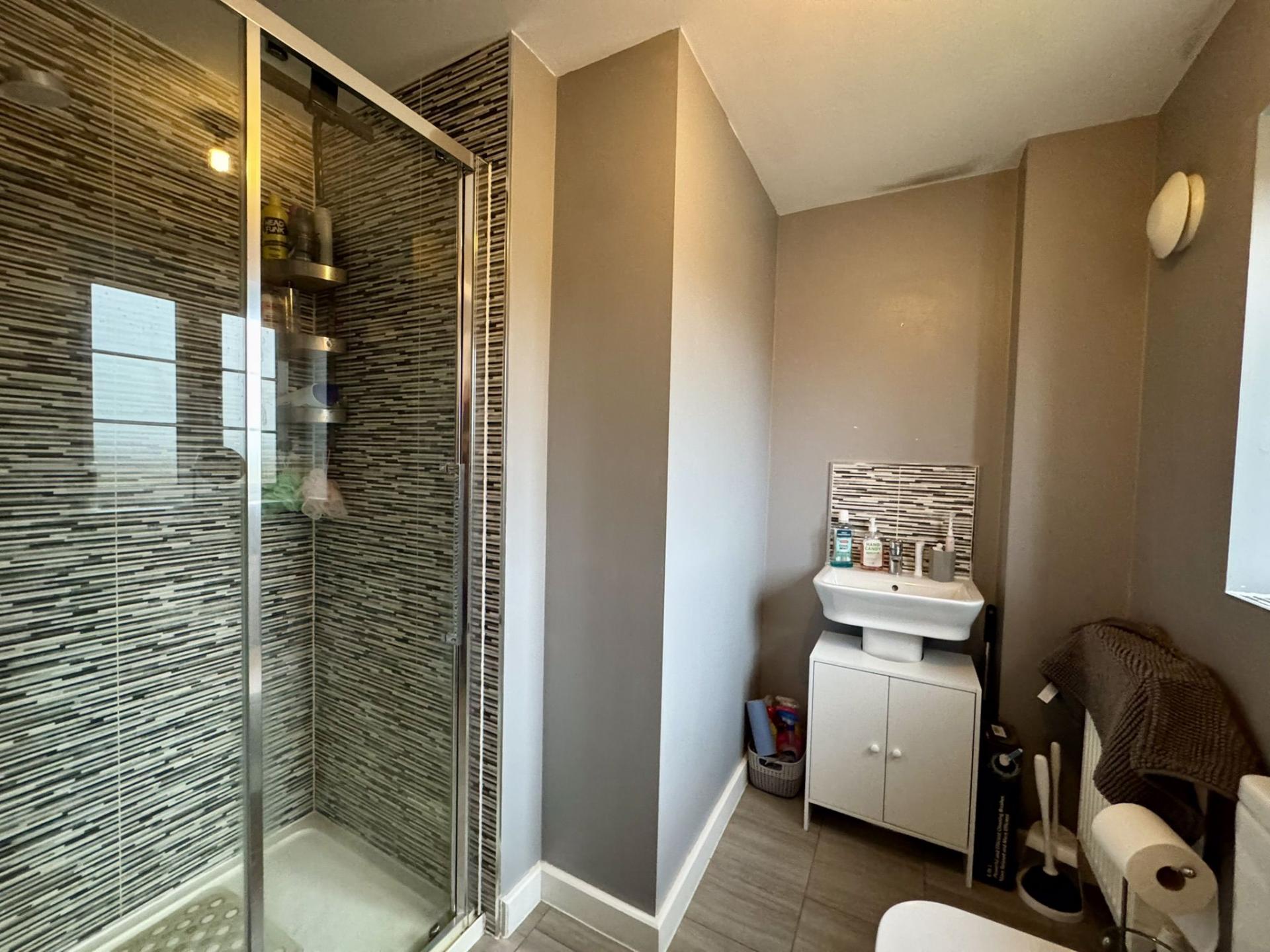 Low level WC, hand basin, shower cubicle and a uPVC window to the front elevation