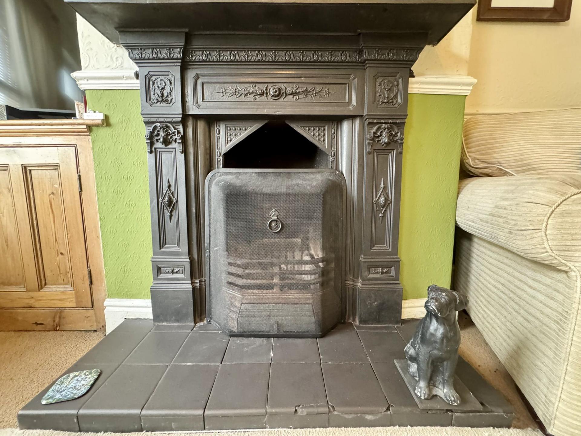 uPVC window and door to the front of the property, open fire with feature fireplace and a radiator