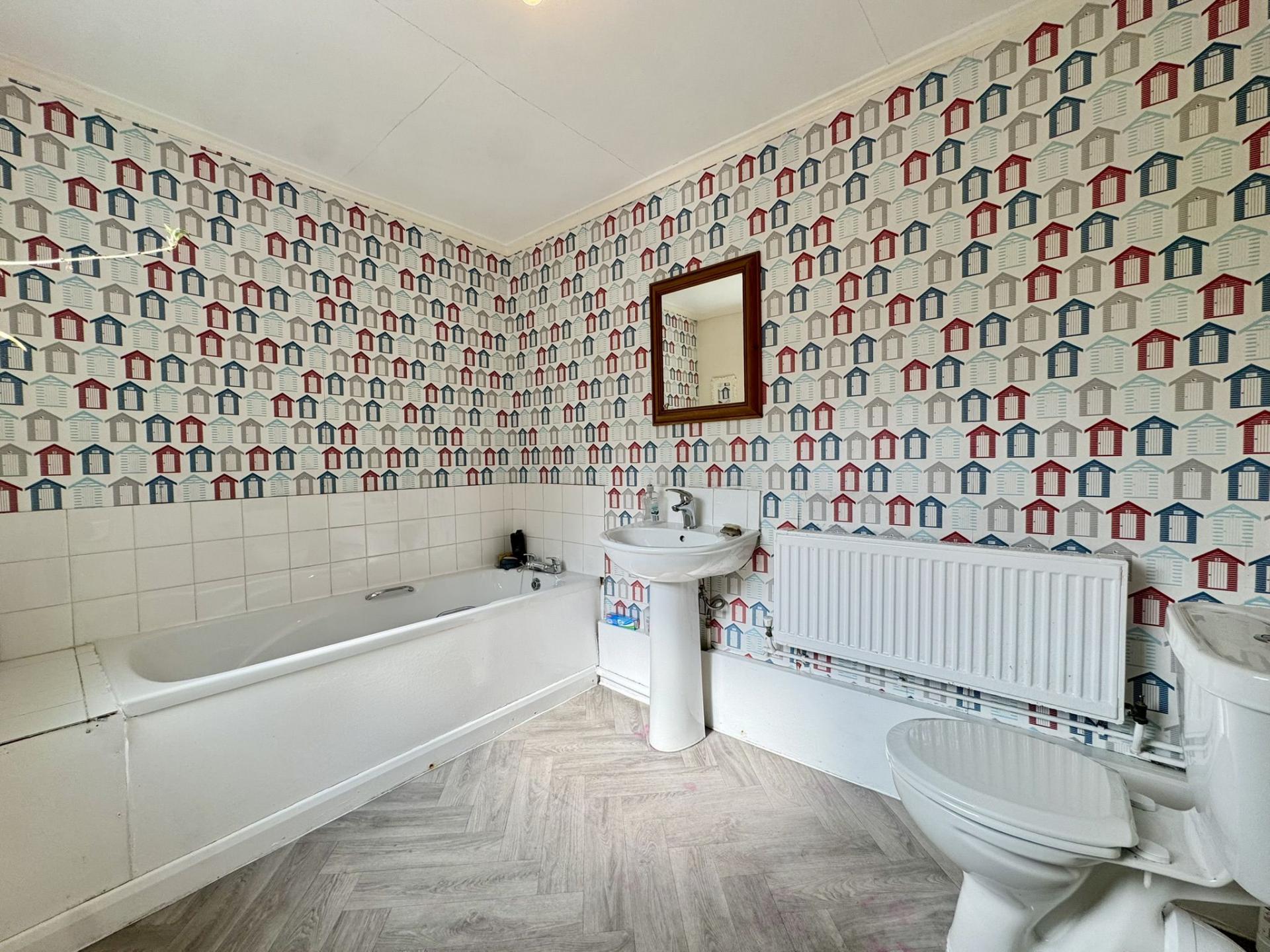 With a fitted panelled bath, low level WC, hand basin, radiator and uPVC window to the side elevation