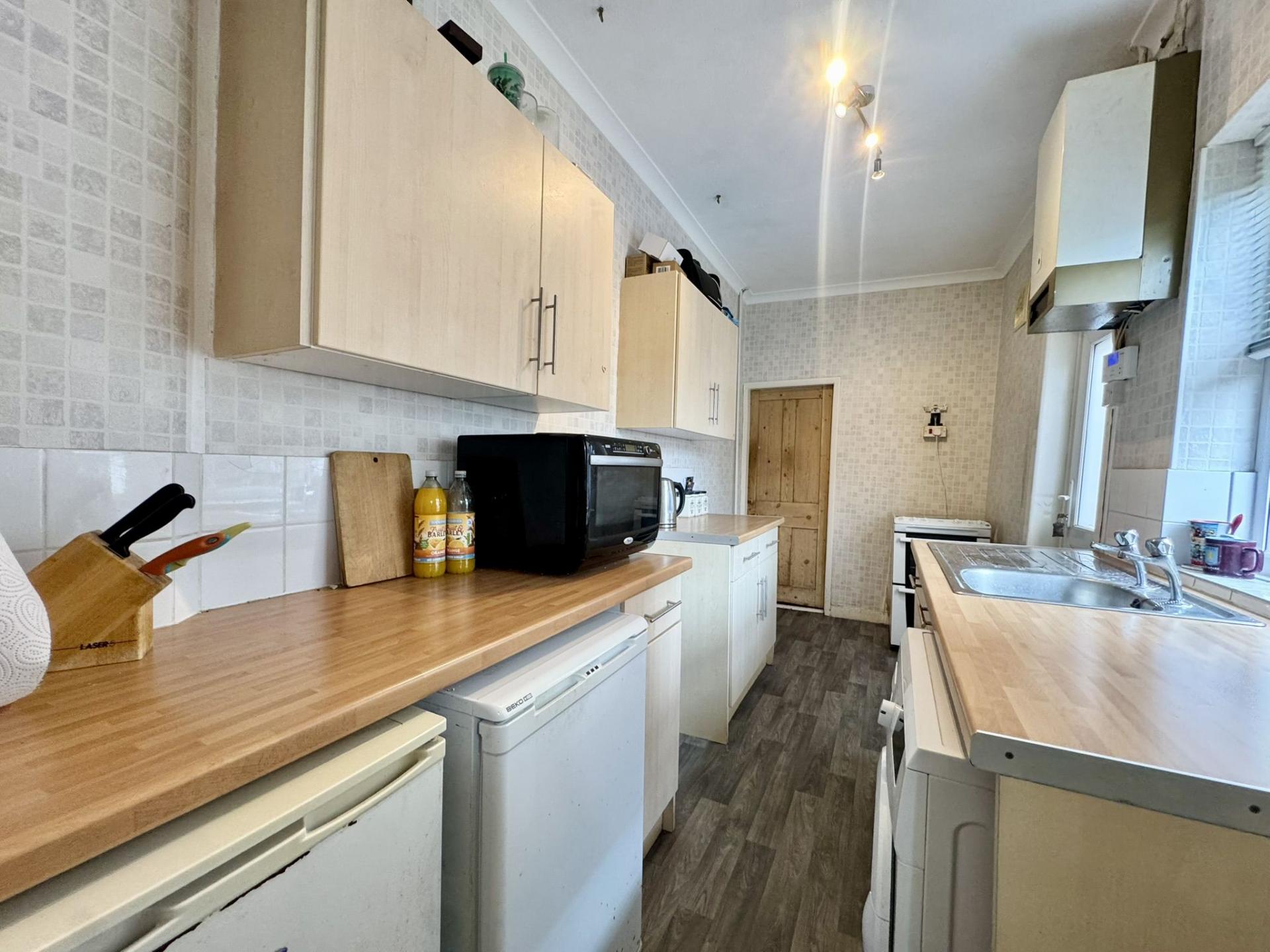 Fitted with a range of wall and base units, sink and drainer unit. Free standing gas hob and cooker, plumbing space for washing machine. uPVC window and door to the side elevation, radiator and boiler housing.