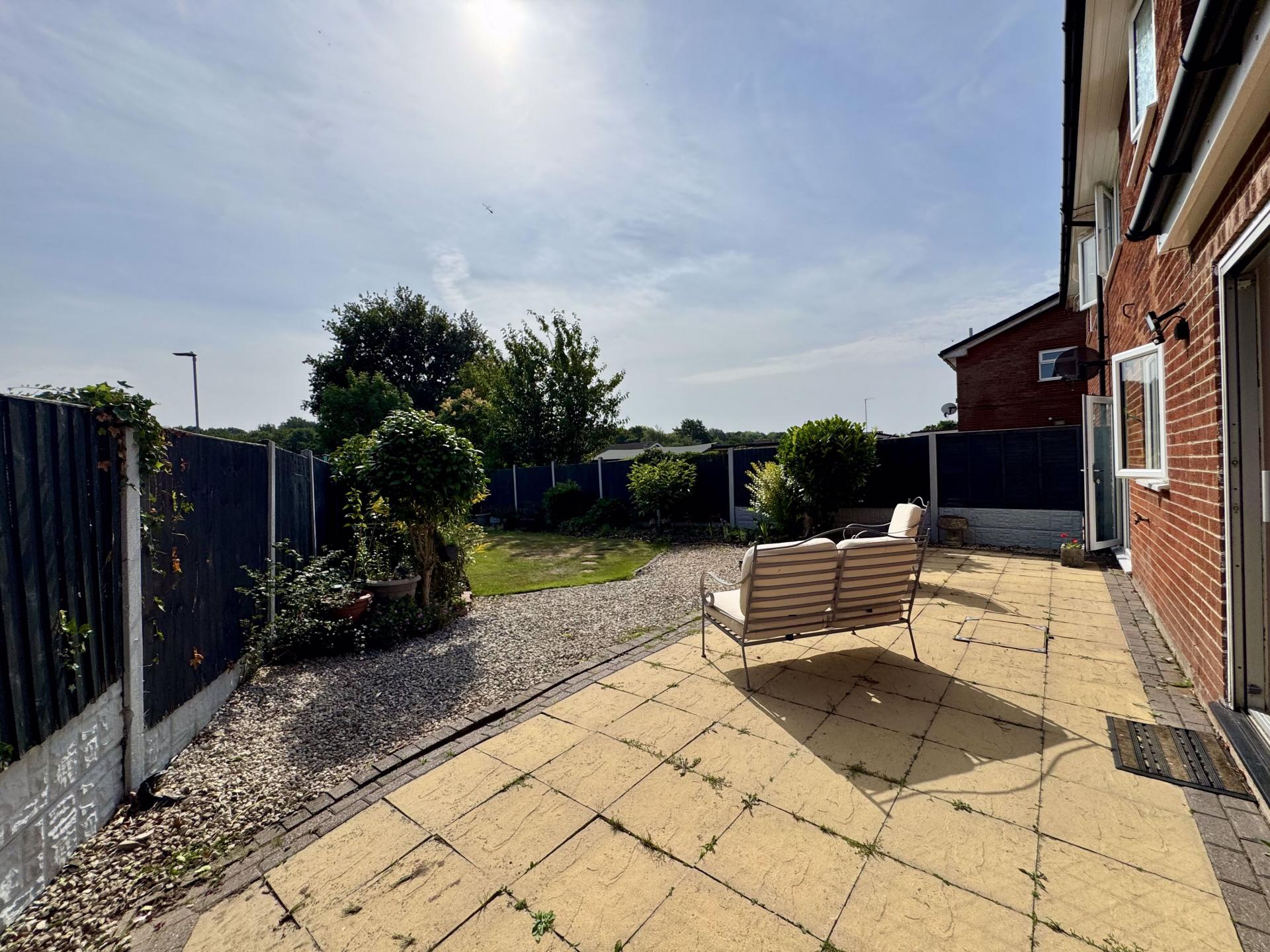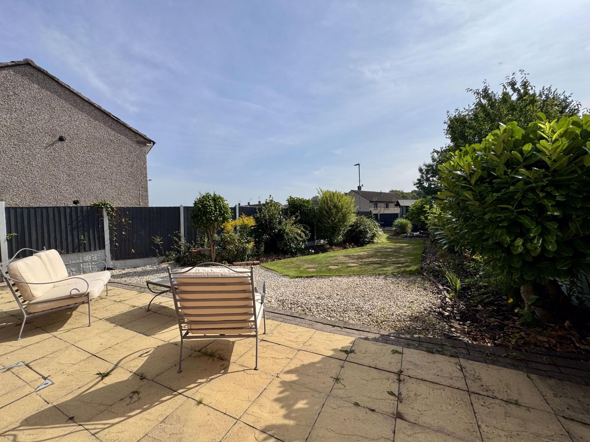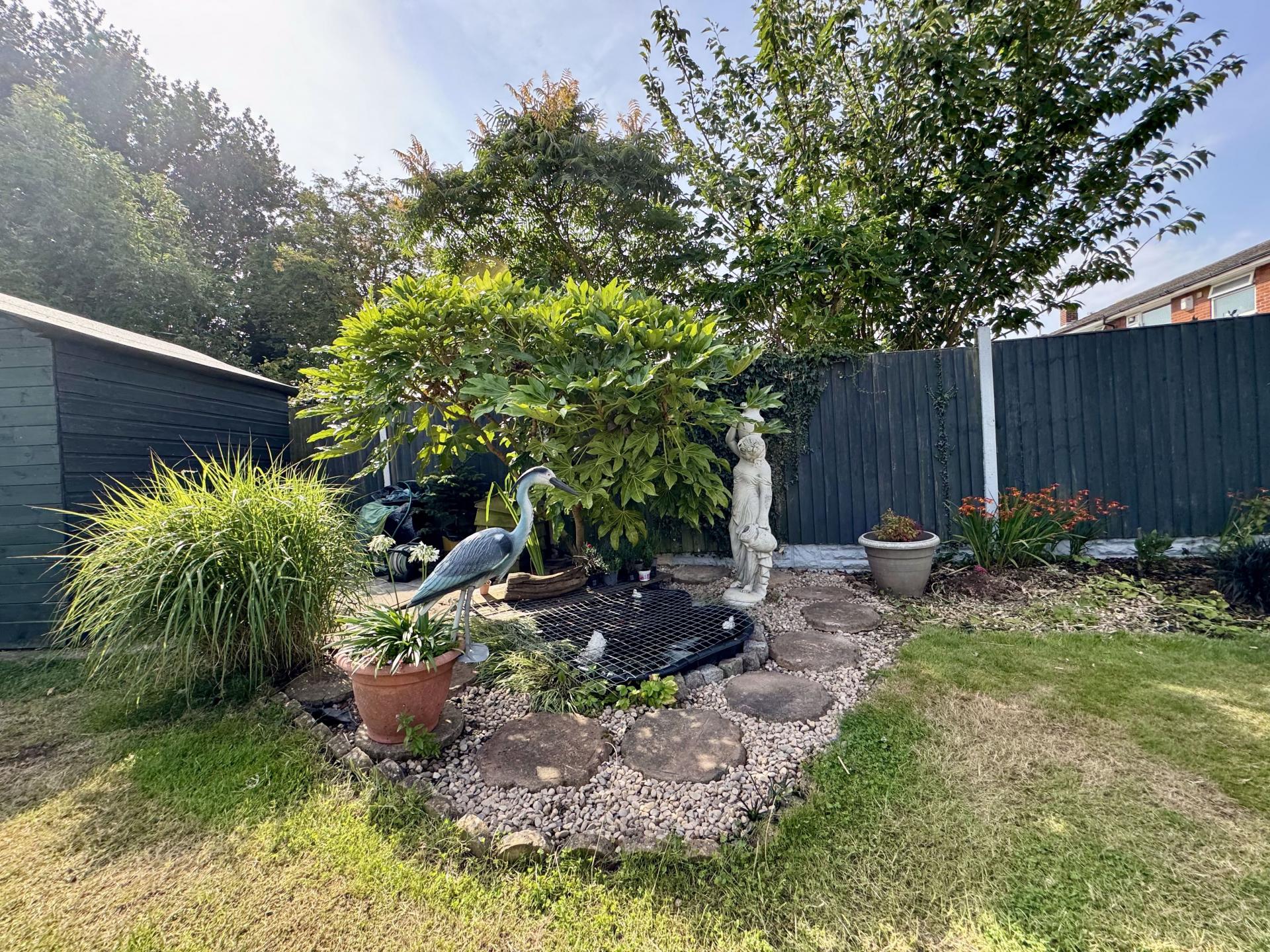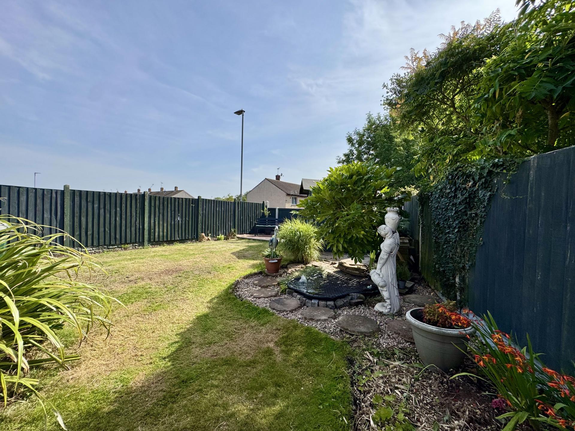 Private rear garden with gate access, two patio seating areas, mainly laid to lawn with mature trees, shrubs and flowers patches. The garden also has a low maintenance covered pond