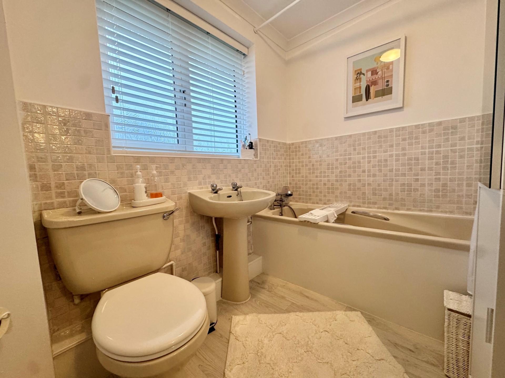 Fitted with a panelled bath, low level WC, hand basin, radiator and uPVC window to the rear elevation