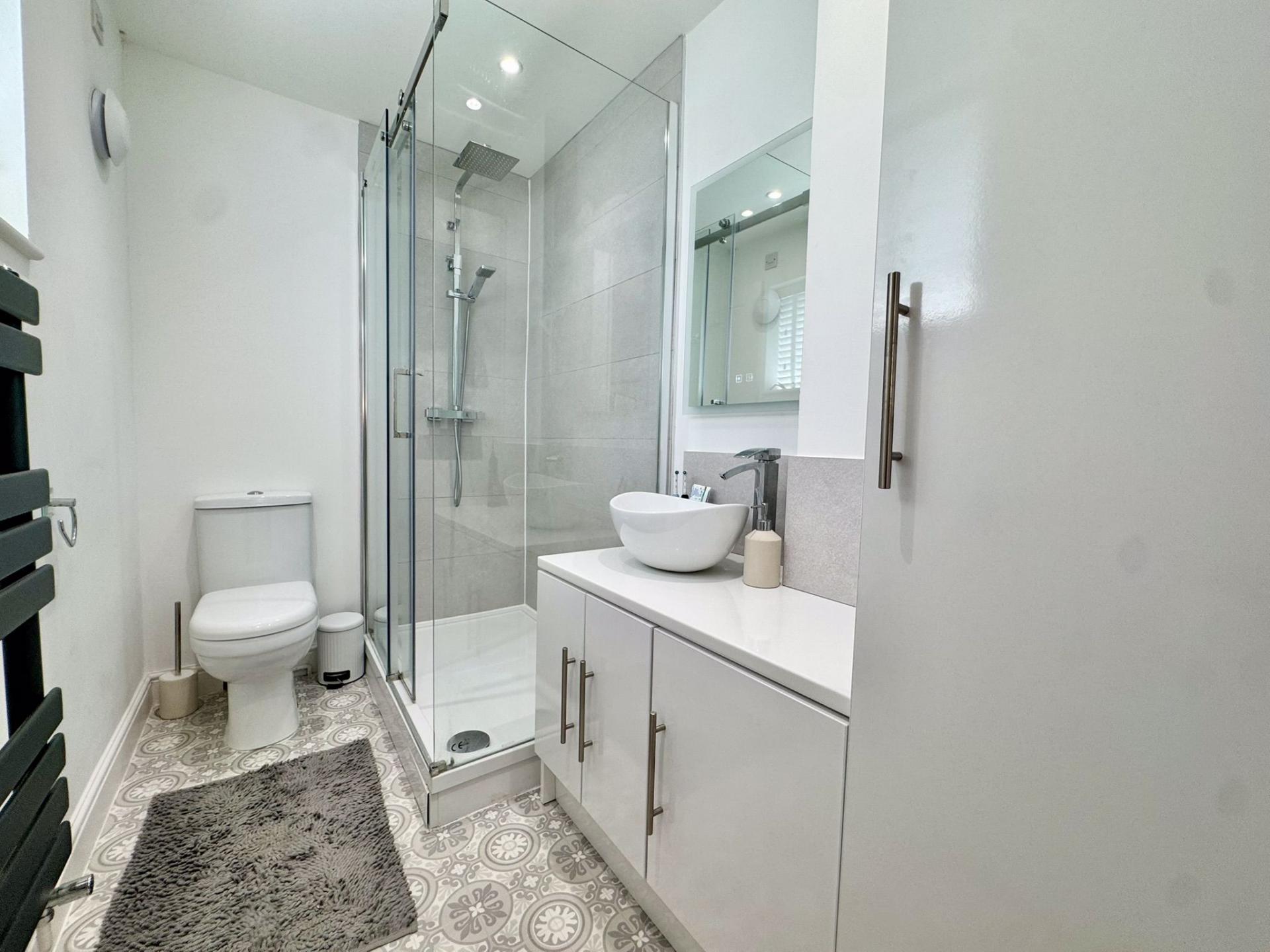 Shower cubicle, hand basin vanity unit, low level WC, towel radiator and uPVC window to the rear elevation