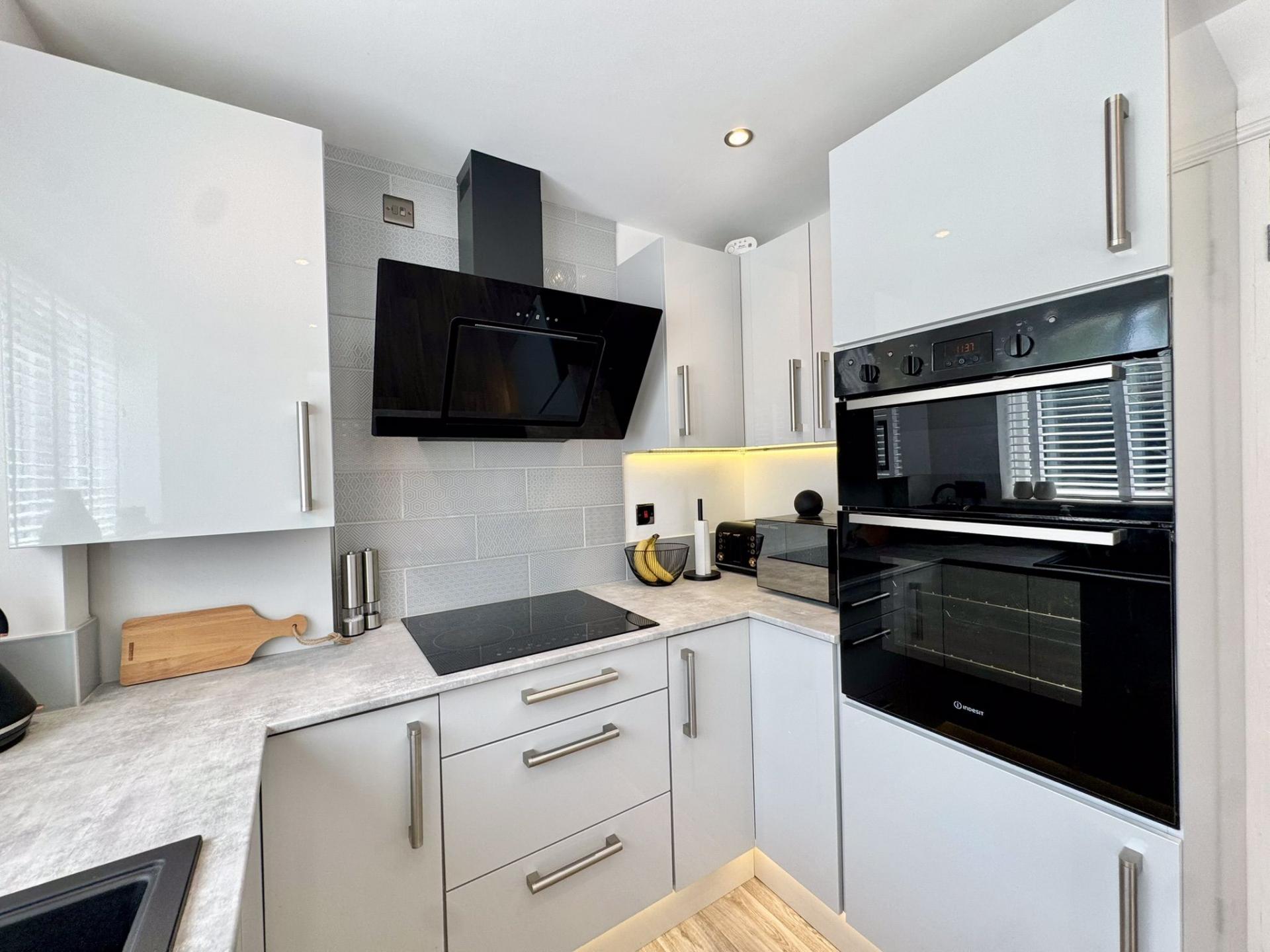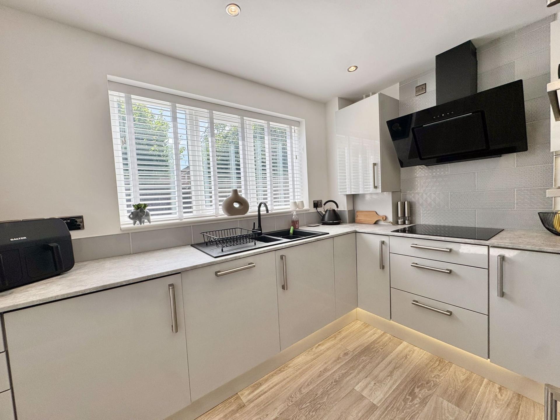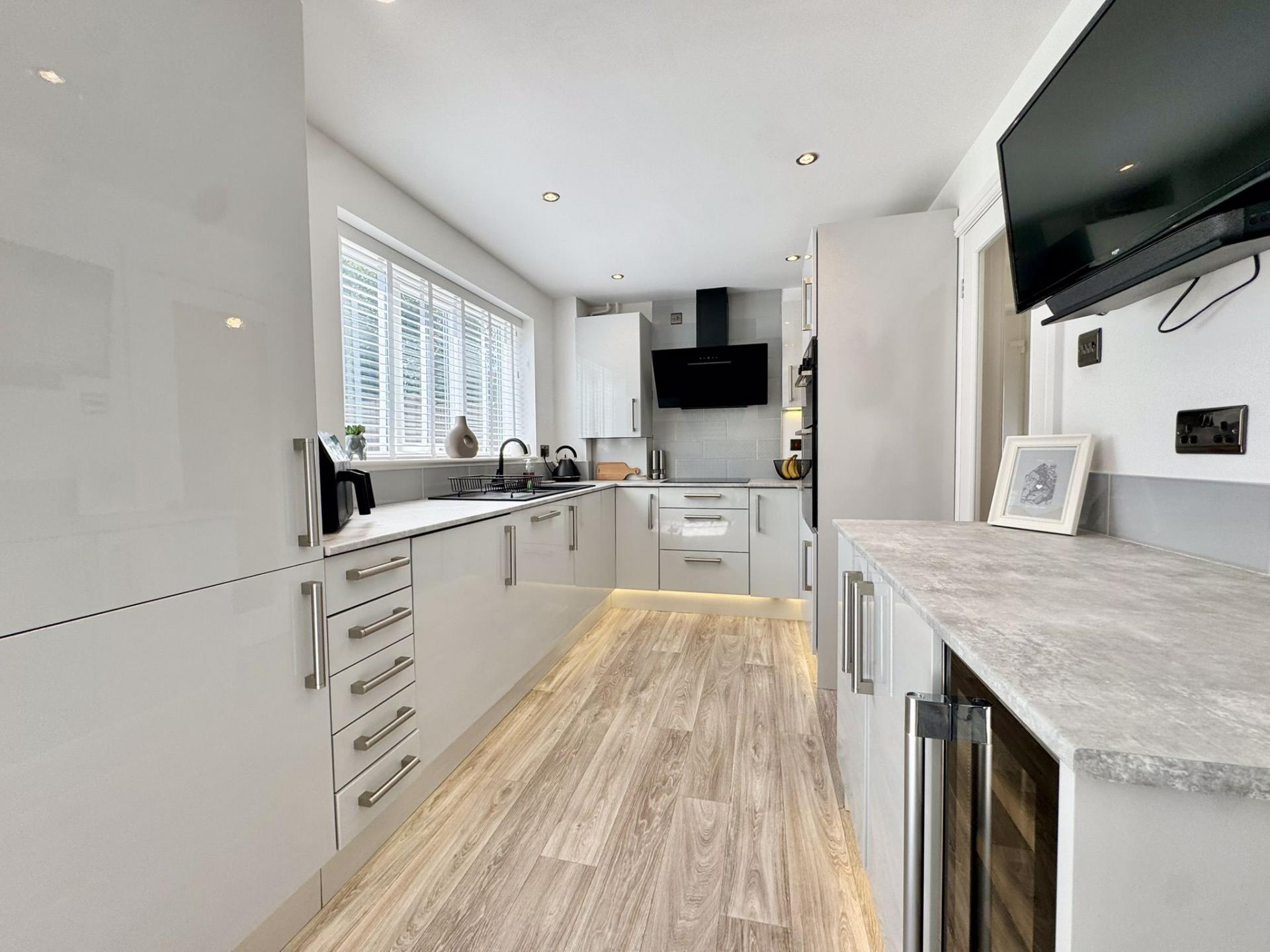 Newly fitted kitchen including a range of wall and base units, sink and drainer unit, electric hob with extractor fan over, electric oven and grill. Integrated fridge and freezer, washing machine and dishwasher. uPVC sliding doors and window to the rear elevation and a radiator. The kitchen also benefits from an integrated wine cooler