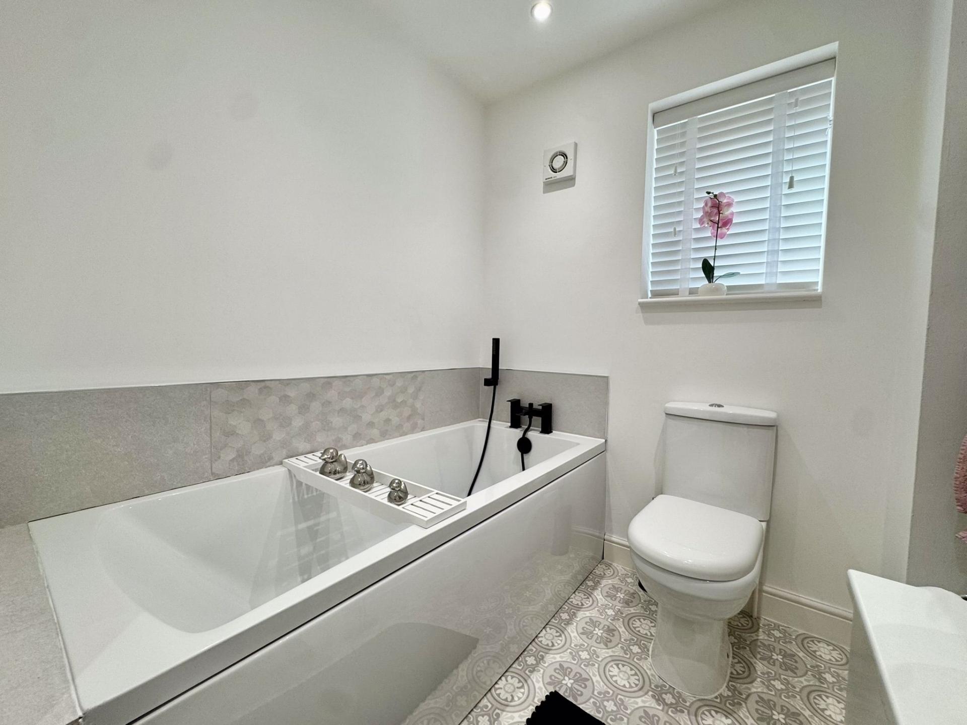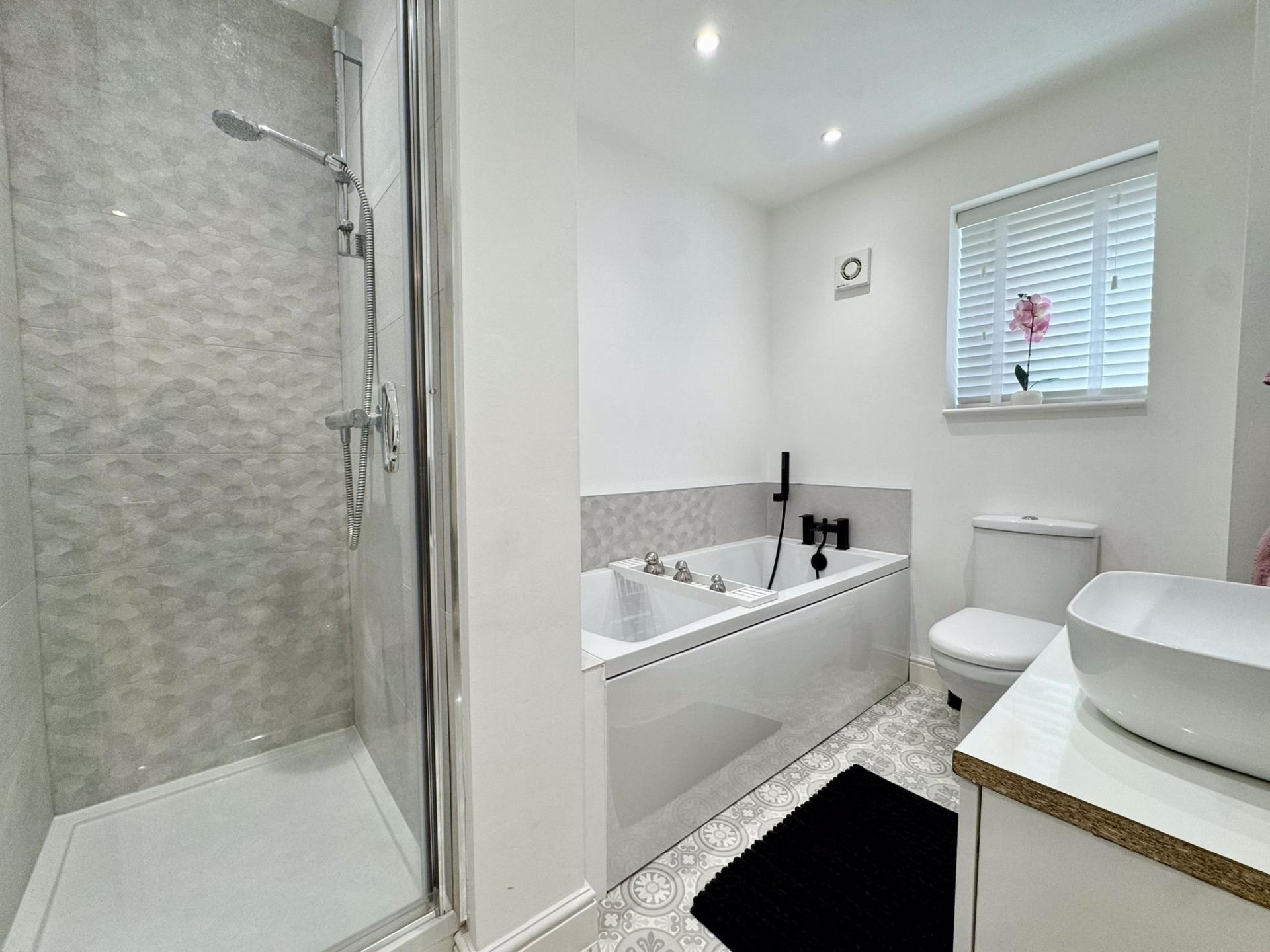 Four piece suite compromising of a panelled bath. shower cubicle, low level WC, hand basin, towel radiator and uPVC window to the side elevation