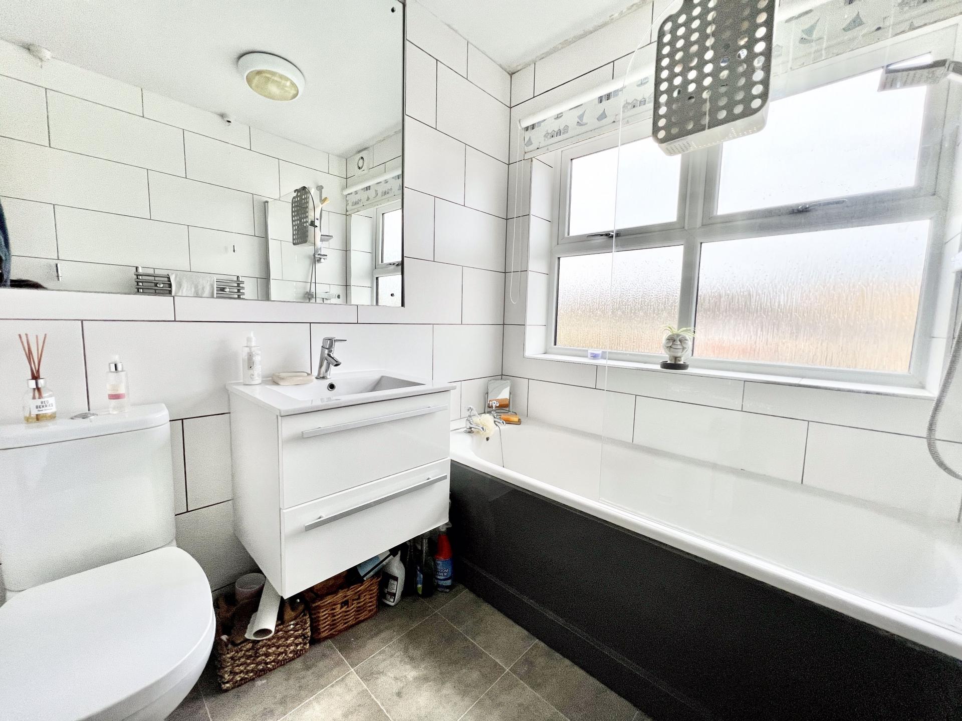 Three piece suite comprising of a panelled bath with shower over, low level W/C, basin vanity unit, heated towel rail and a uPVC window to the rear elevation.