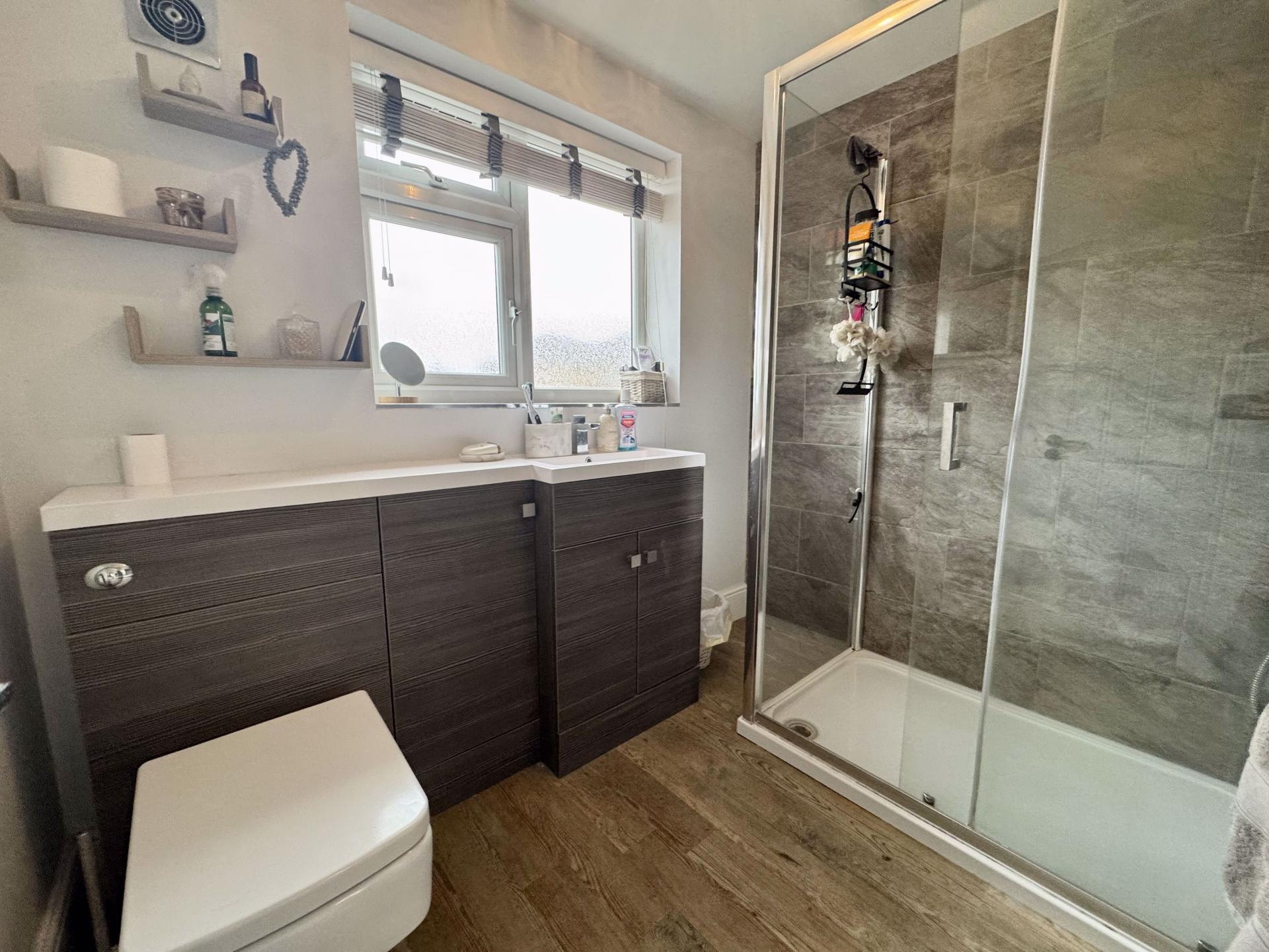 Fitted with a three piece suite comprising of a shower cubicle, low level WC, hand basin, radiator and uPVC window to the front elevation