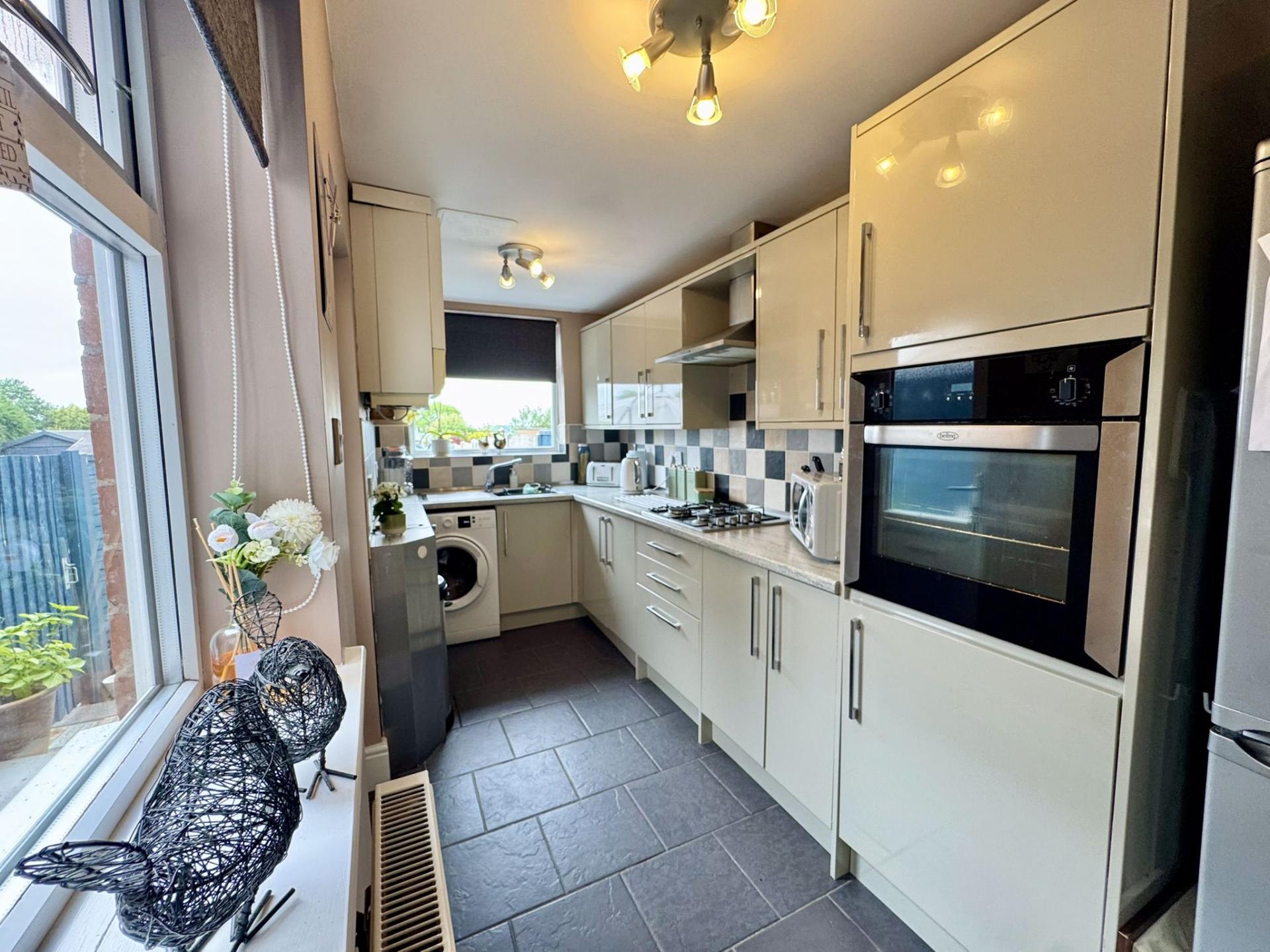 Fitted with a range of wall and base units, sink and drainer unit, plumbing space for a washing machine, gas hob with extractor fan over and electric oven. uPVC window to the rear elevation and uPVC door to the side elevation