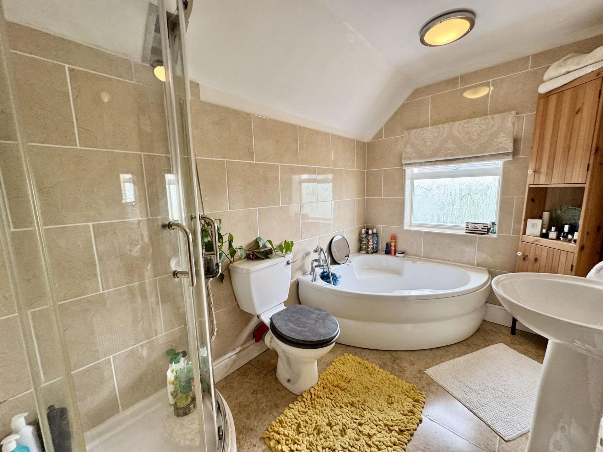 Four piece suite compromising of a corner bath, shower cubicle, low level WC and hand basin. uPVC window to the rear elevation and a radiator