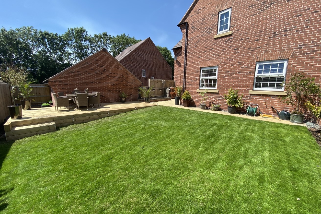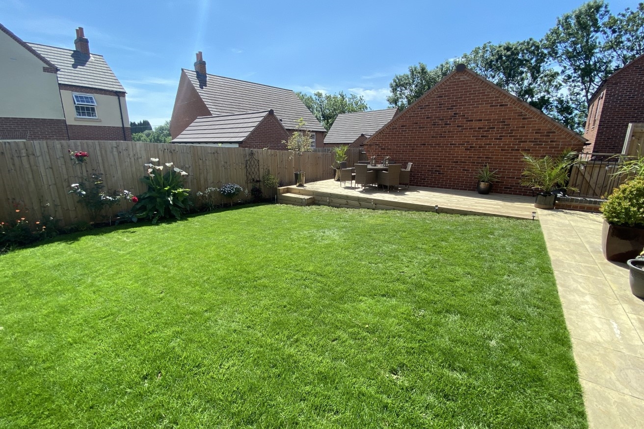 Mainly laid to lawn with a decking area, patio area, flower borders and side access.