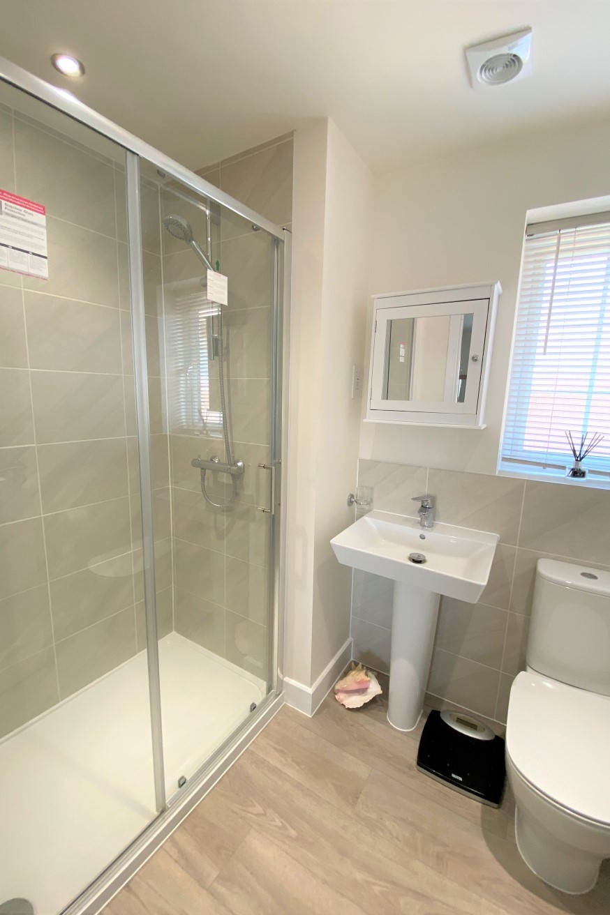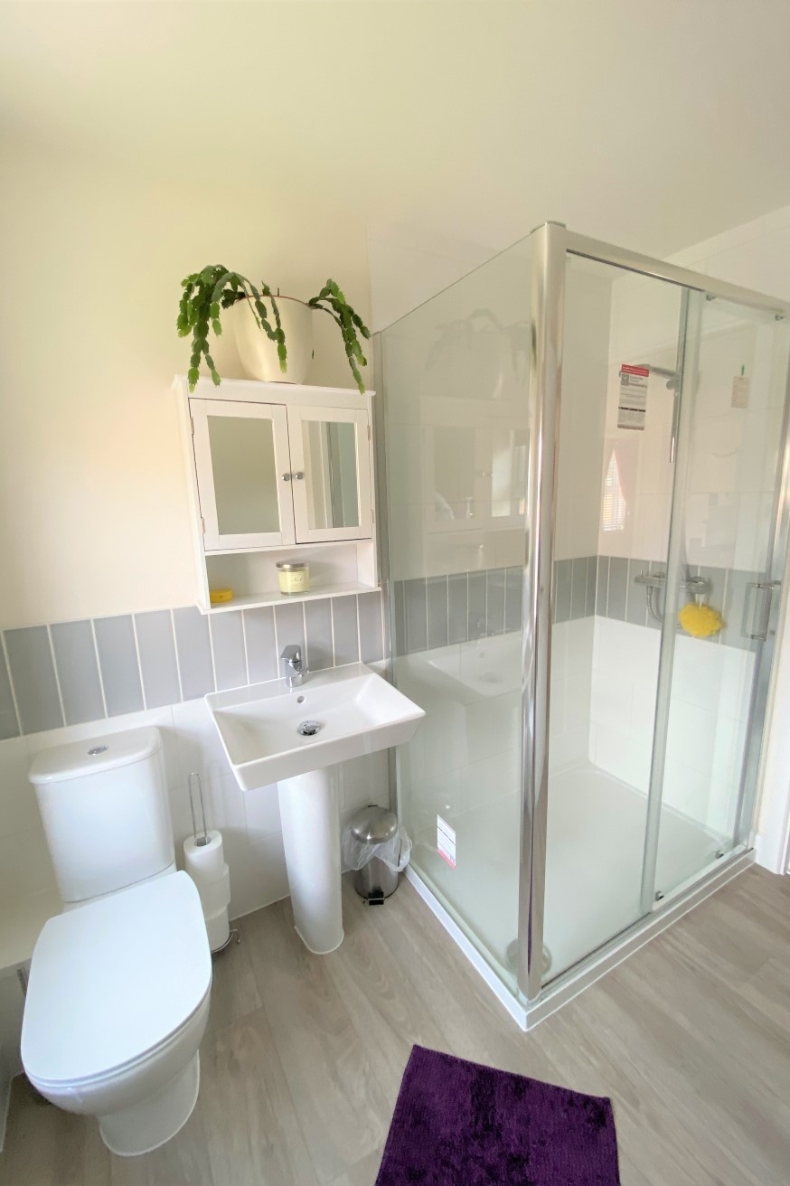 Three piece suite comprising of a double shower cubicle, low level WC, wash hand basin, heated towel rail and uPVC window to the side elevation.
