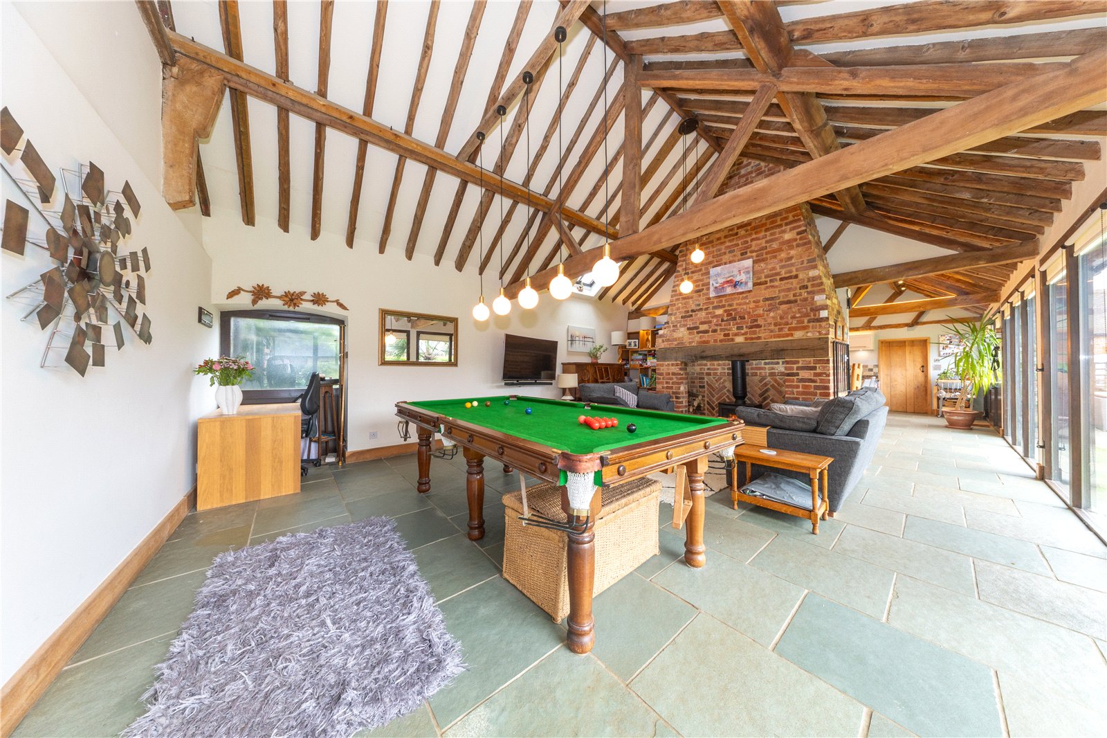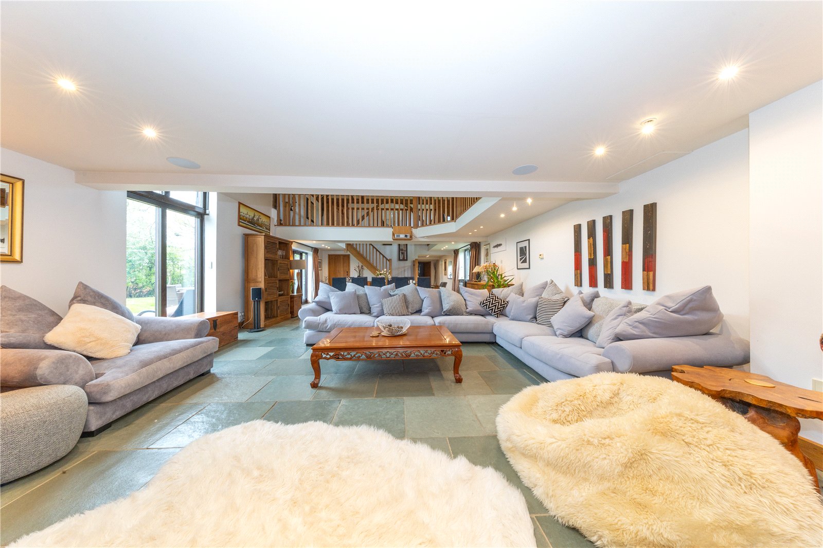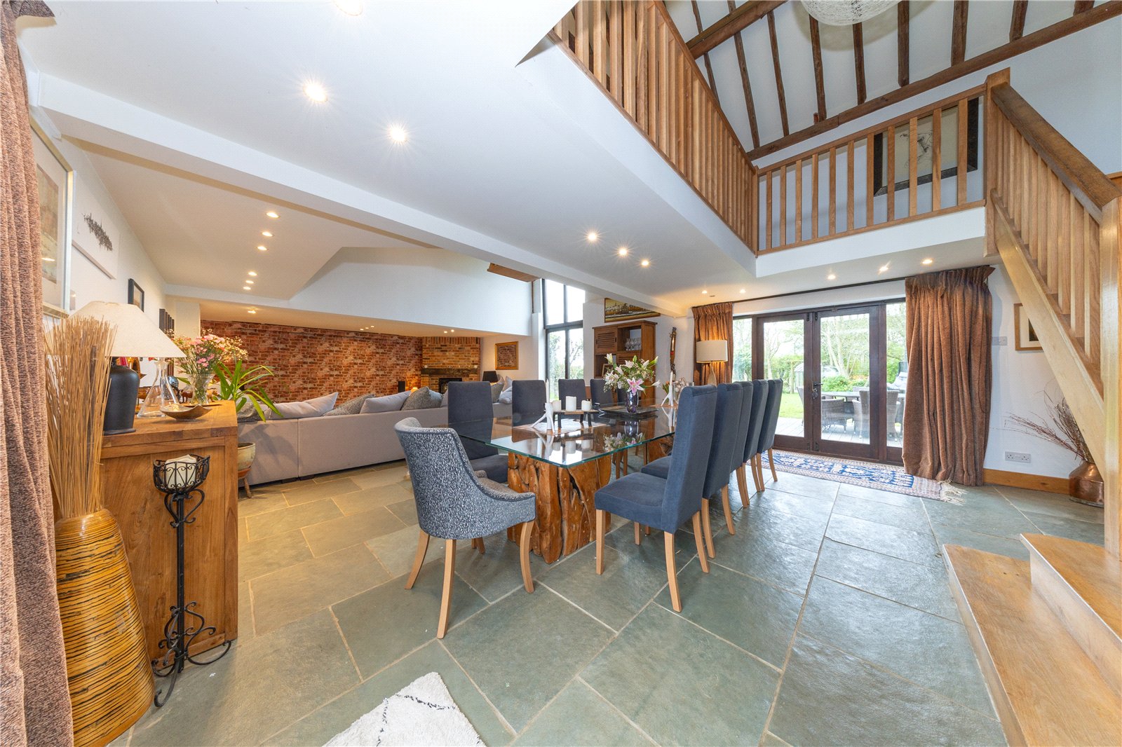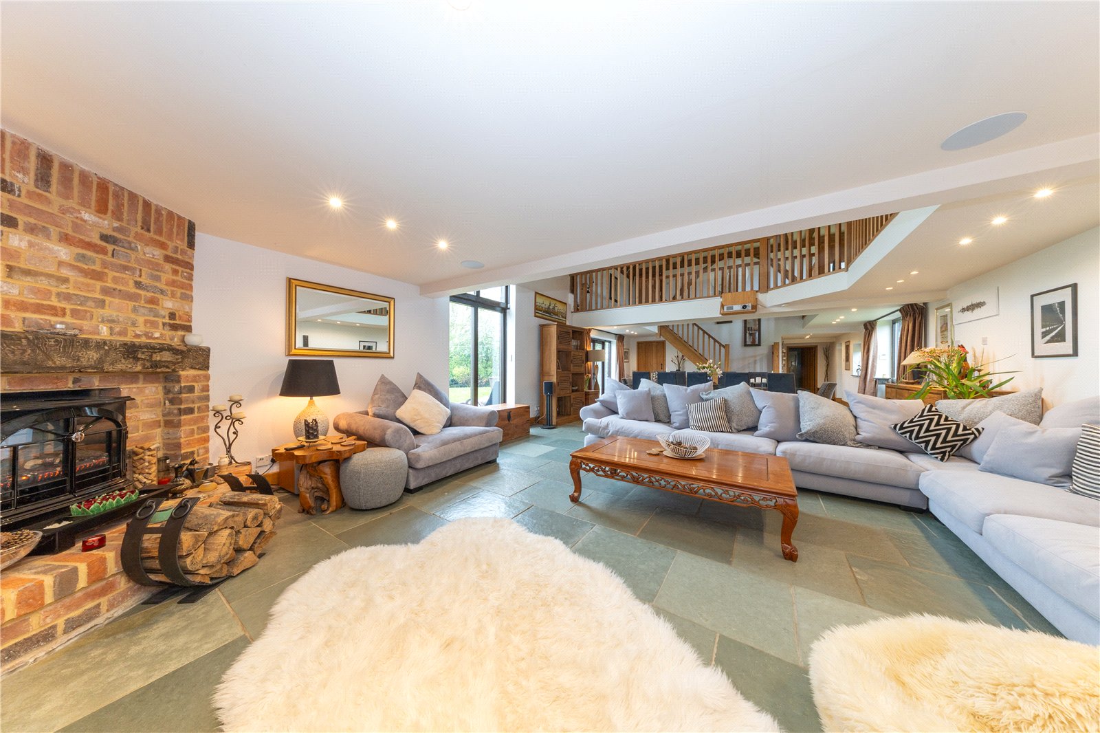 The property comprises a 38ft family sitting room with high vaulted ceilings and exposed beams together with a brick built fireplace and feature electric wood burner. There is also a 21ft dining room, 22ft kitchen/breakfast room, utility, downstairs WC and 2 garages, one of which has been converted to a gym. There is also a downstairs bathroom and 2 double bedrooms on the ground floor. Upstairs there are 2 further double bedrooms, both with en-suite bathrooms with the master bedroom having the addition of a dressing room and separate shower and corner bath. Also, each bedroom has stairs to a duplex snug which are ideal for extra space, study area or storage rooms. Externally there is a gated entrance with shingle driveway for several cars, front and back gardens mostly laid to lawn with established shrubs and a pond to the rear.