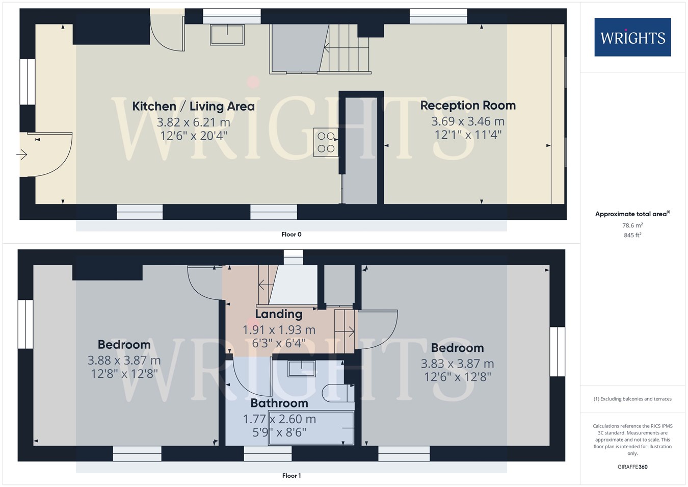 1.77m x 2.60m (5' 10" x 8' 6")