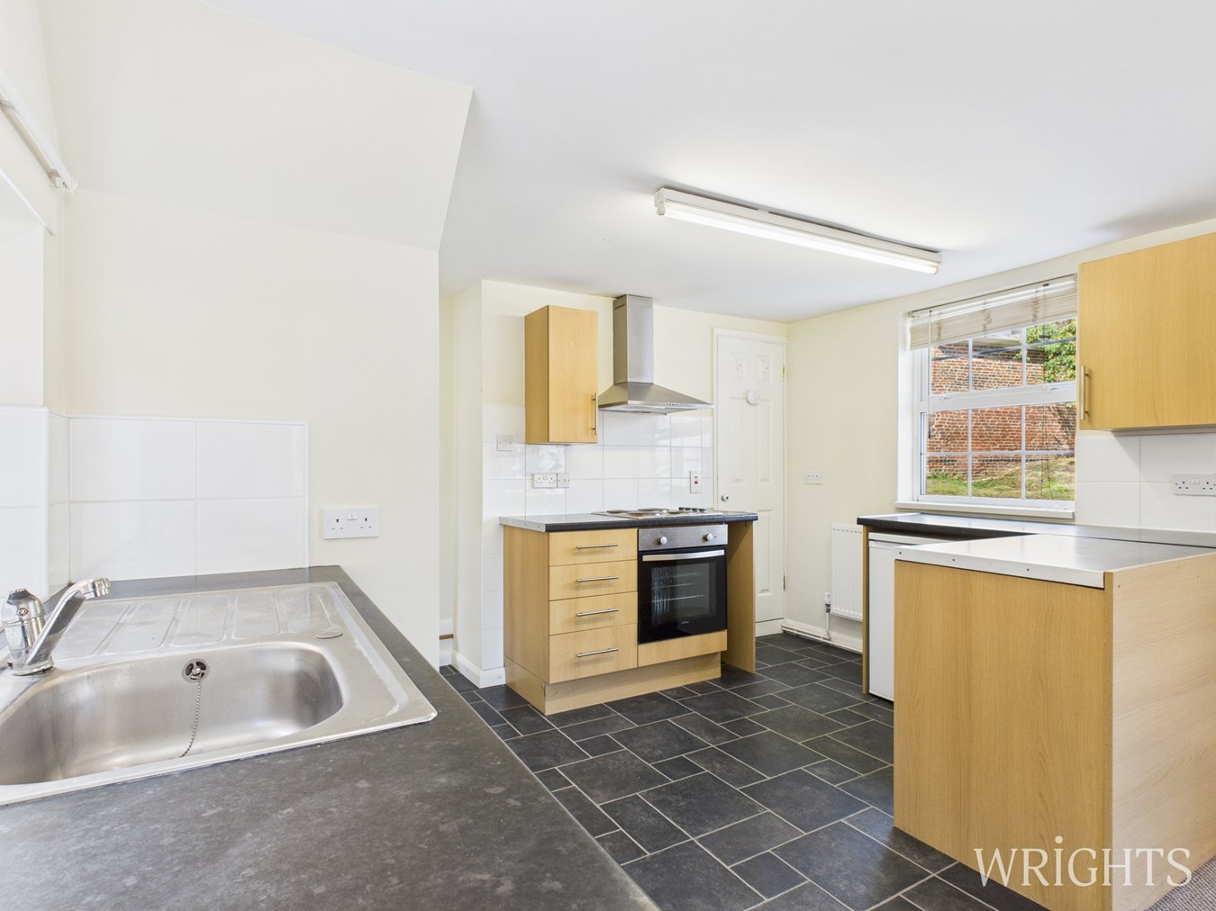 Dual aspect spacious living area. Fitted kitchen, with integrated appliances and access to the courtyard garden.