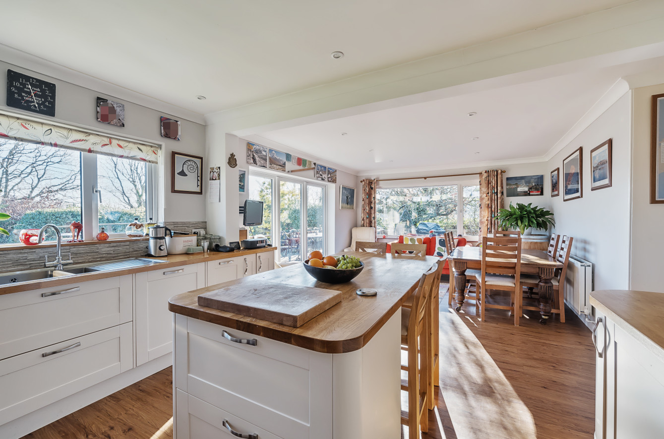 The accommodation is entered via a welcoming entrance hall which leads through to a comfortable triple-aspect sitting room. This delightful space enjoys direct access to the garden and is centred around a wood-burning stove, creating a warm and inviting focal point. Extending across the rear of the property is an impressive kitchen/dining room, forming the true heart of the home. This wonderfully sociable space enjoys a lovely outlook over the garden to the estuary and beyond, with doors opening directly onto the garden terrace, creating a seamless connection between indoor and outdoor living. The kitchen is thoughtfully designed with a central island, extensive storage and a range of integrated appliances, making it equally suited to everyday family life and entertaining.