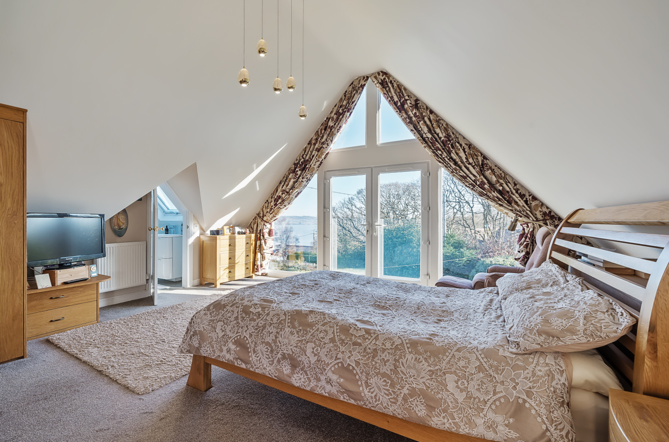 On the first floor are two generous double bedrooms. The superb principal bedroom is a particularly striking space, featuring a vaulted ceiling and dramatic full-height glazing to the gable end, perfectly framing the fabulous estuary views. Double doors open onto a Juliette balcony, allowing the outlook to be fully appreciated, while the room is further complemented by an en-suite with WC and basin. The guest bedroom also benefits from an en-suite shower room and an adjoining room, currently arranged with two single beds, which could alternatively be used as a dressing room or walk-in wardrobe.