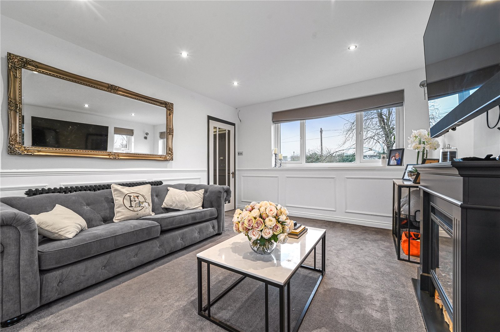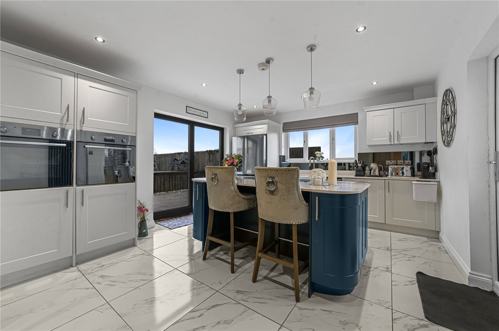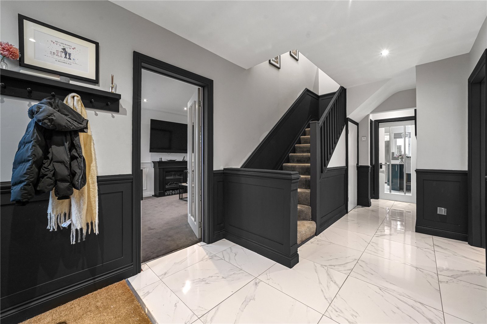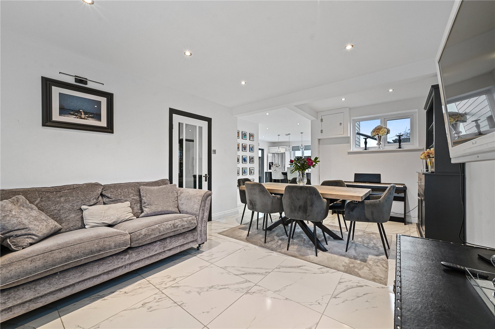 The ground floor is arranged to suit both everyday living and entertaining, beginning with a welcoming entrance hall, accessed through impressive double-doors, that sets the tone with its clean lines and contemporary finish. From here, the living room provides a comfortable and well-proportioned space, positioned to enjoy a pleasant outlook and offering a calm retreat from the main living areas.