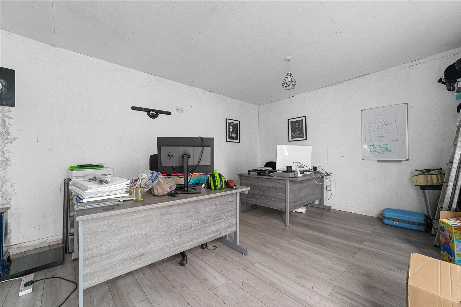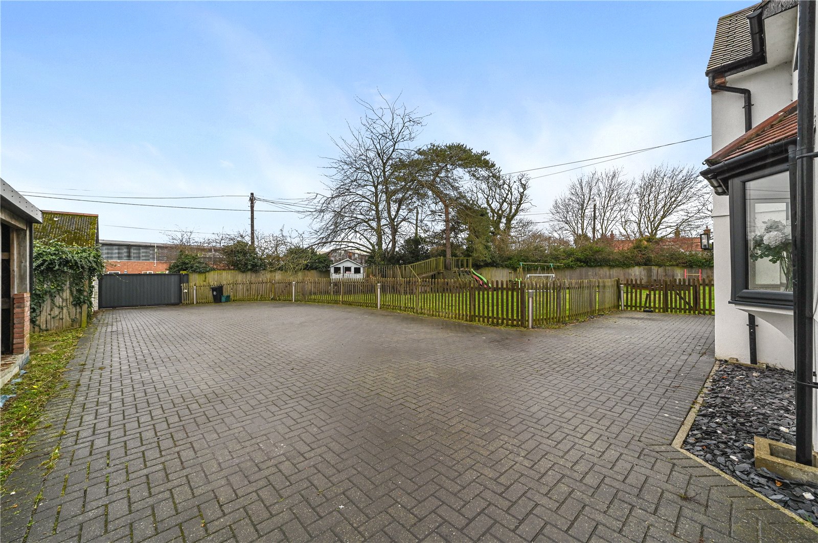 A range of useful outbuildings adds further versatility, including a large office or gym with its own WC, a utility and laundry room, a garage and a separate workshop. Electric gates open onto a substantial driveway providing ample parking for several vehicles and leading directly to the garage, creating a secure and practical arrival space that complements the scale of the property and grounds.