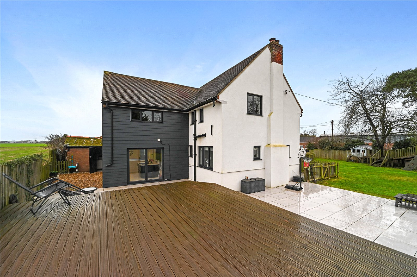 The outside space is a particular feature of the property, with east-facing gardens enjoying open views across the surrounding farmland. The gardens are mainly positioned to the front and side and are laid out to provide both open lawned areas and defined spaces for relaxation and entertaining. A raised, decked area creates an attractive seating area and incorporates an overground pool, offering a private and enjoyable setting during the warmer months.