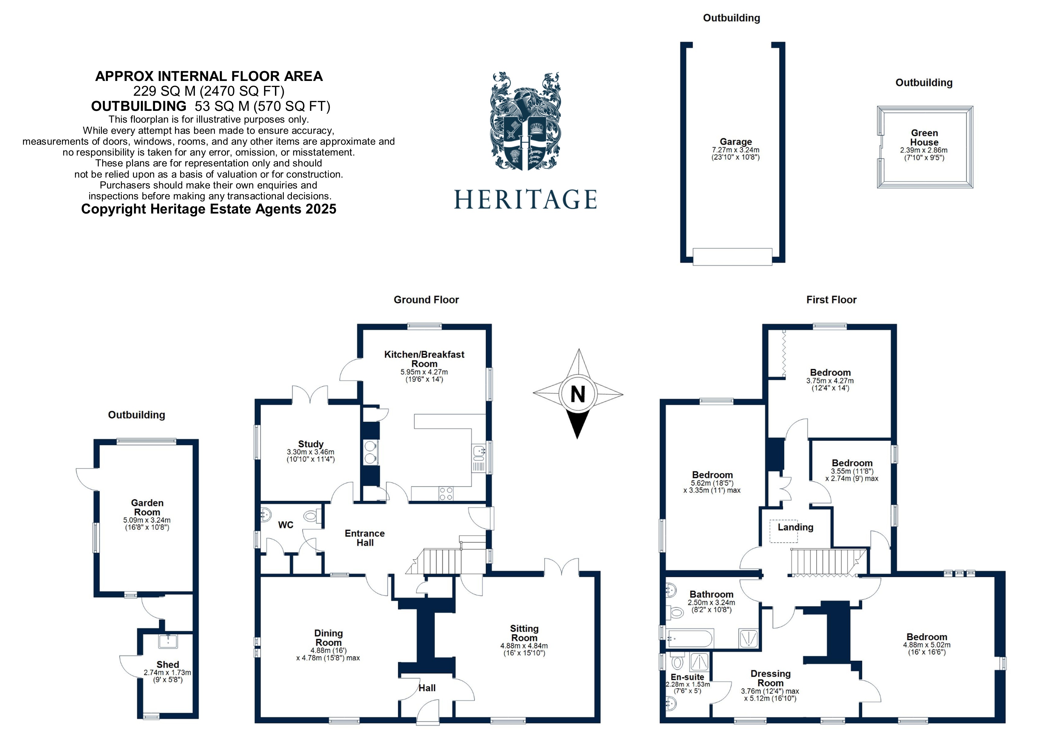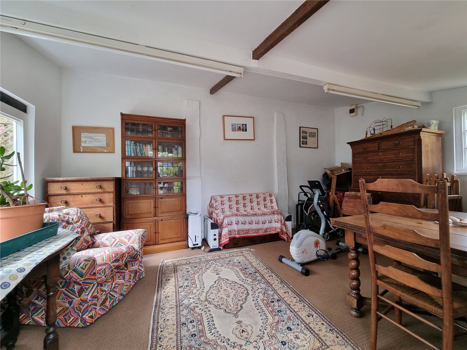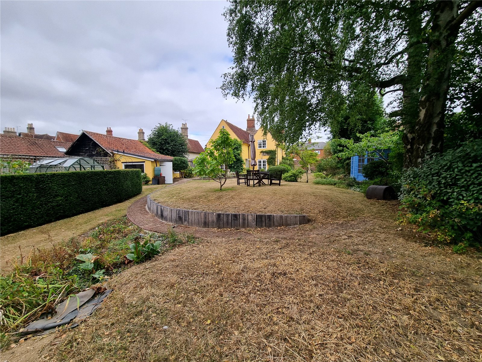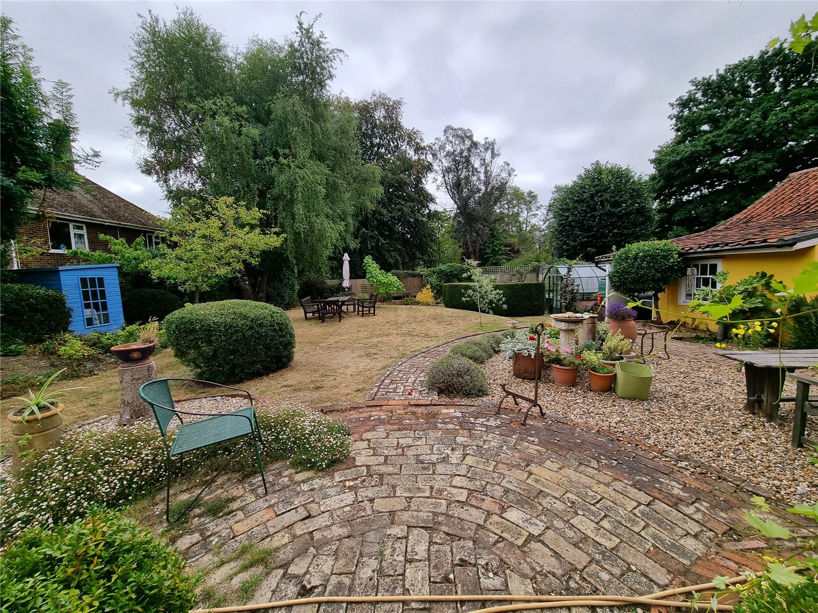 The gardens are a delight — partly walled, private, and laid out with brick pathways leading to different areas. A drive-through garage provides access to a rear parking area, while a collection of outbuildings includes a summerhouse, shed, studio with picture window. The studio is a particularly desirable area which would make an ideal home office.