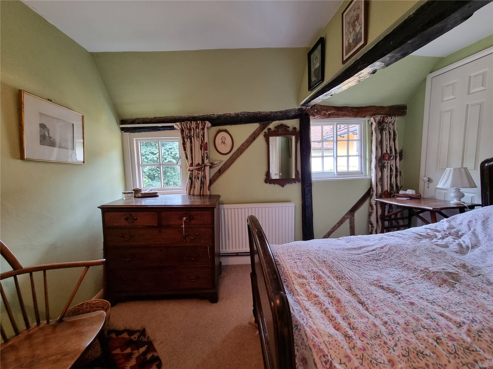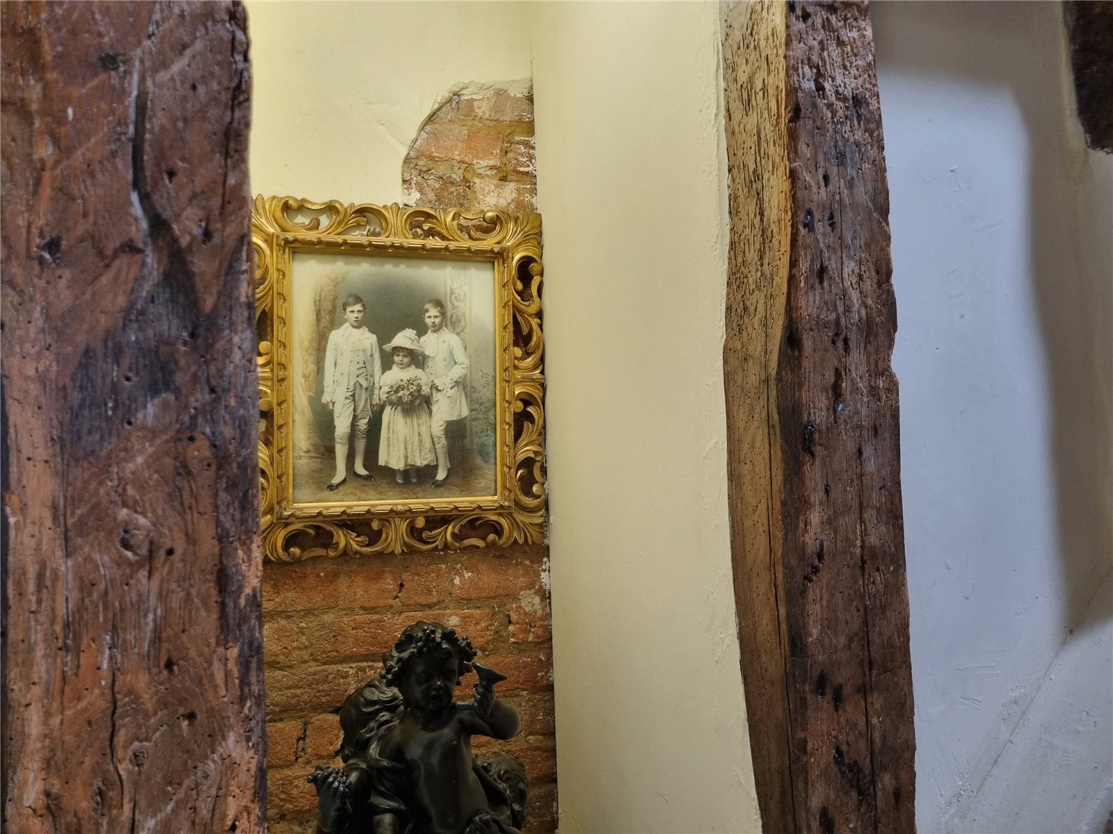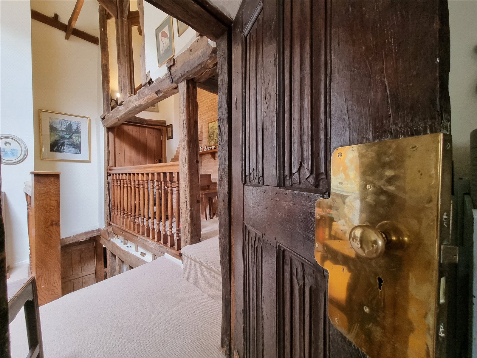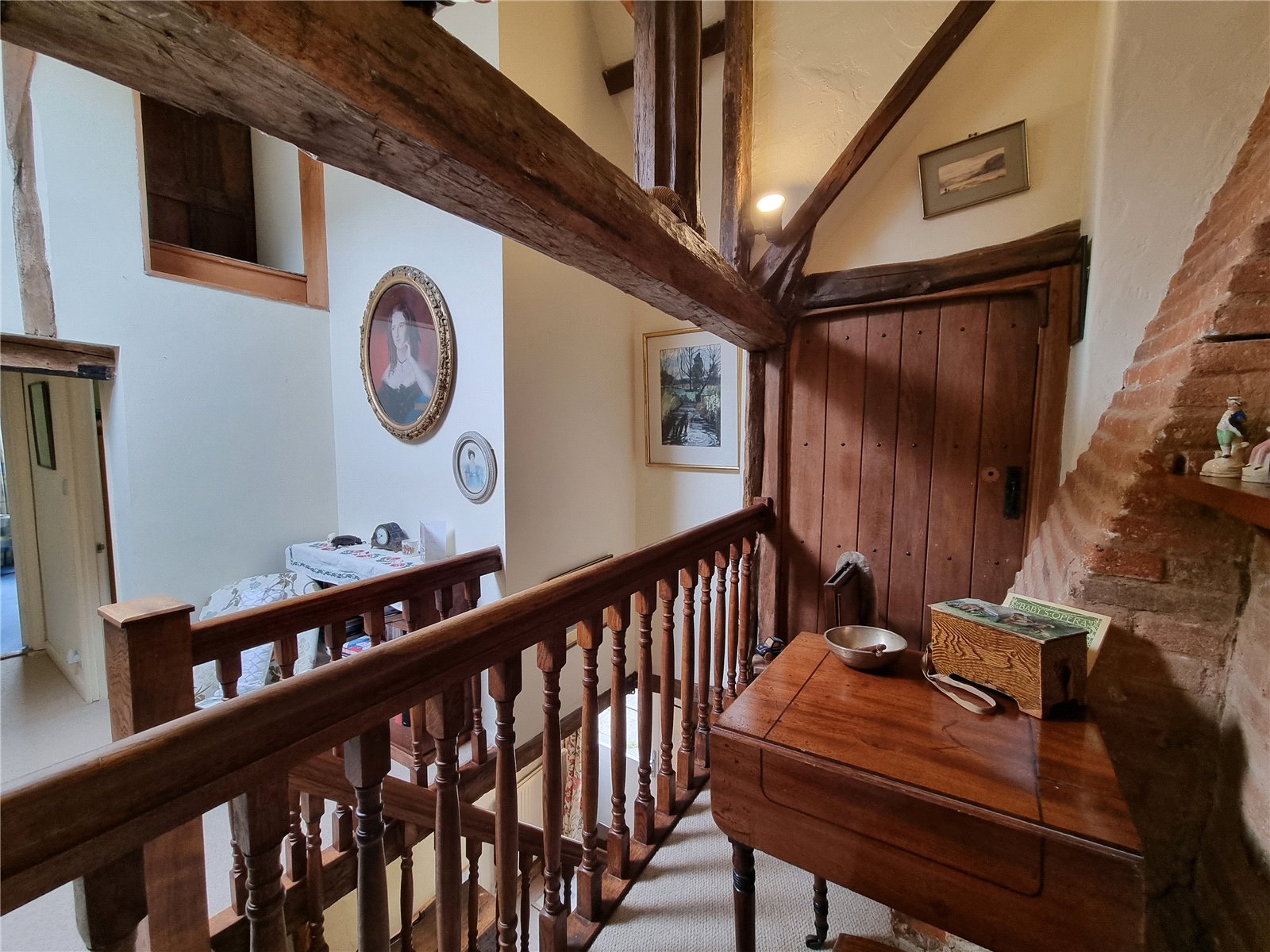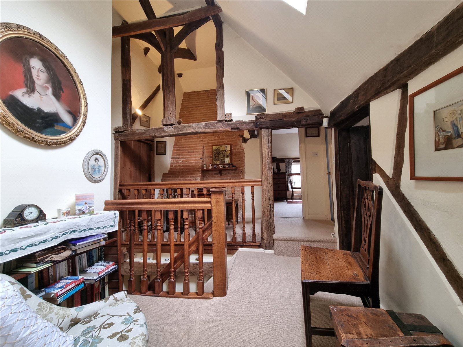 The first-floor landing is full of interest, showcasing the exposed red brick chimney and a beautifully preserved beams. A door also leads to the attic, accessed via ladder, adding to the sense of character and provides a good ampunt of storage.