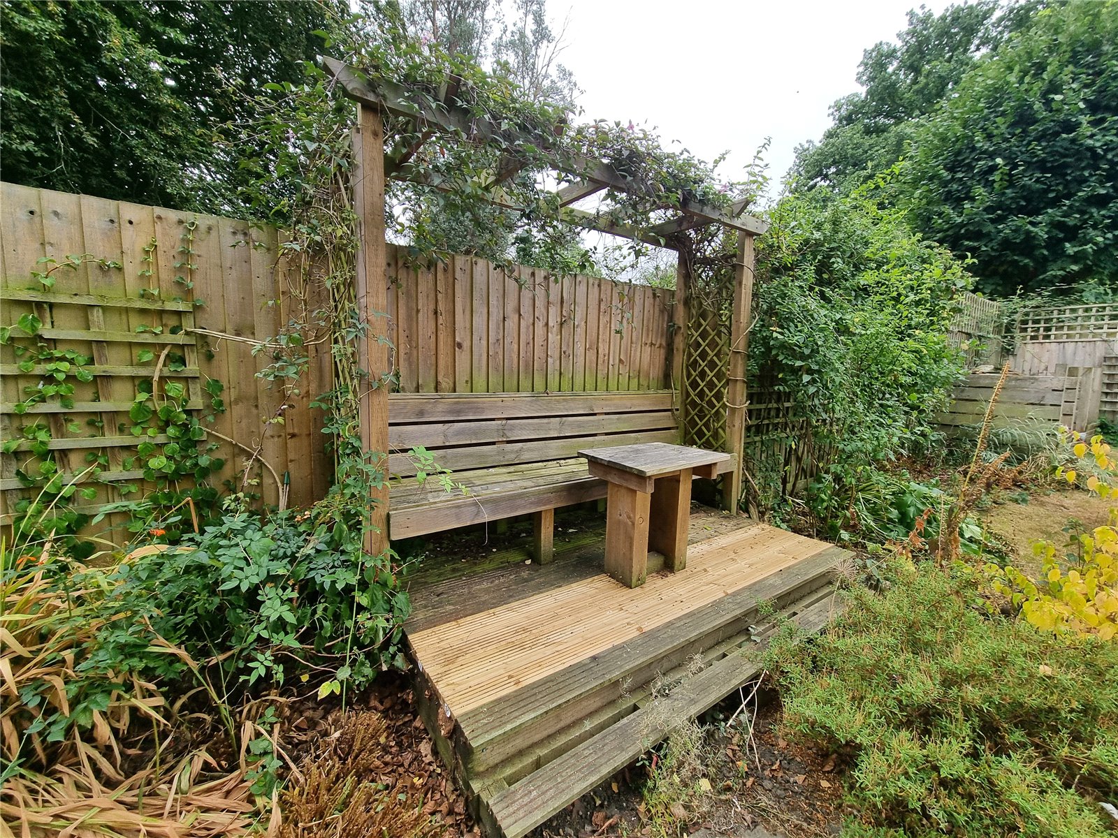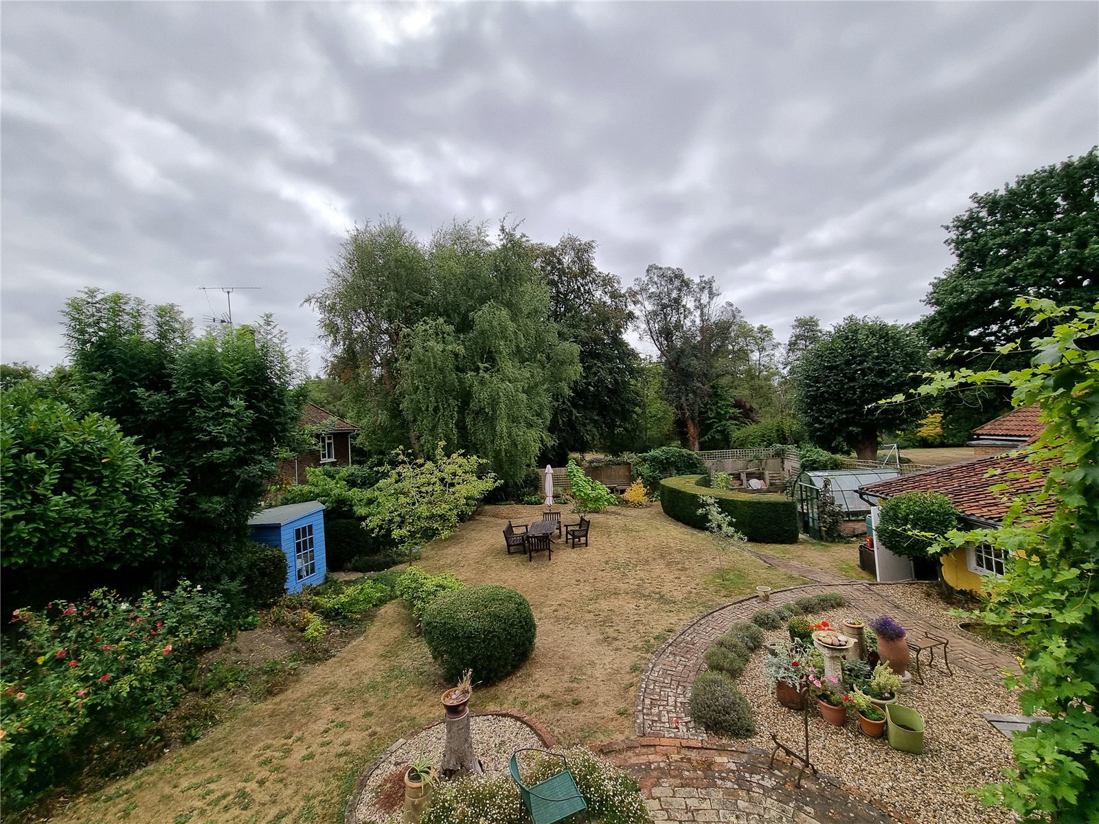 The grounds are arranged with charm and practicality in mind, featuring a two-tiered lawn, established planting, and a hidden kitchen garden screened by a fine yew hedge with its own greenhouse and vegetable beds. Among the highlights are a mature silver birch, magnolia stellata, pieris salicifolia and catalpa bignonoides, while at the far end of the garden an arbour provides a tranquil seating spot. To the south, expansive views over mature trees in a neighbouring garden enhance the sense of peace and seclusion.