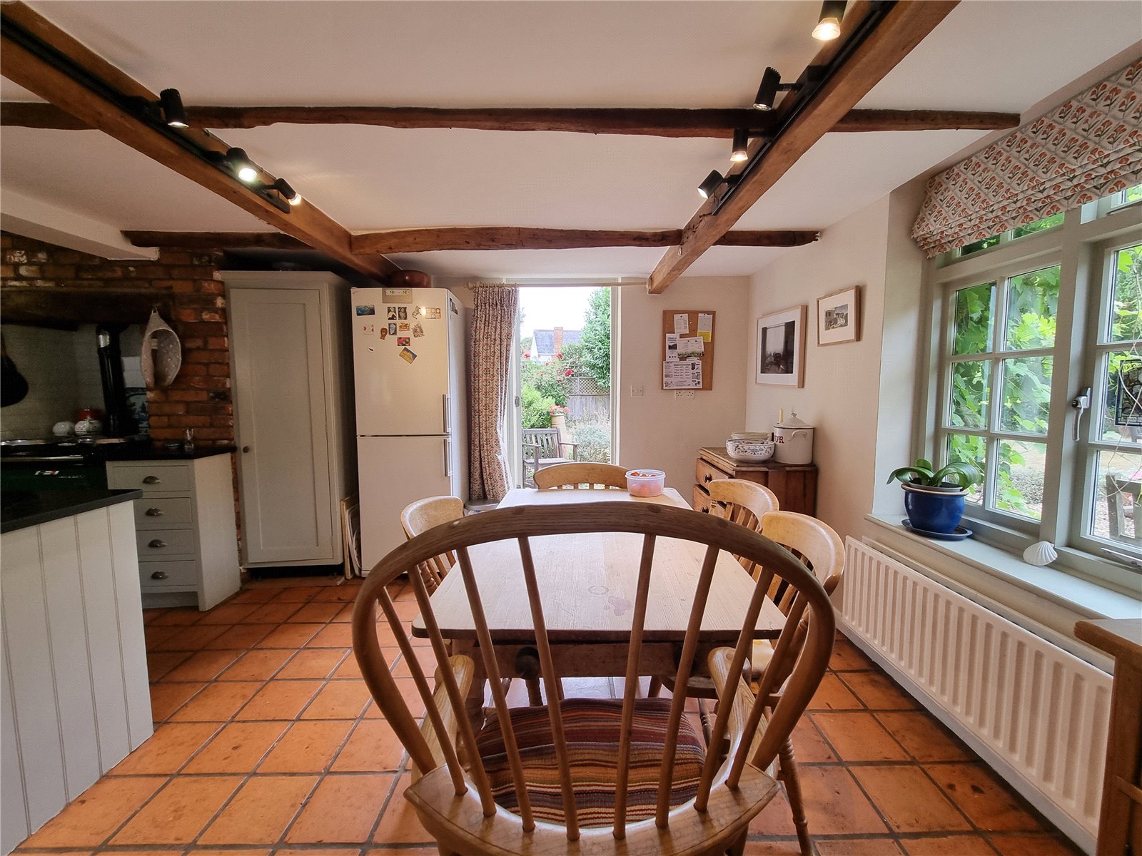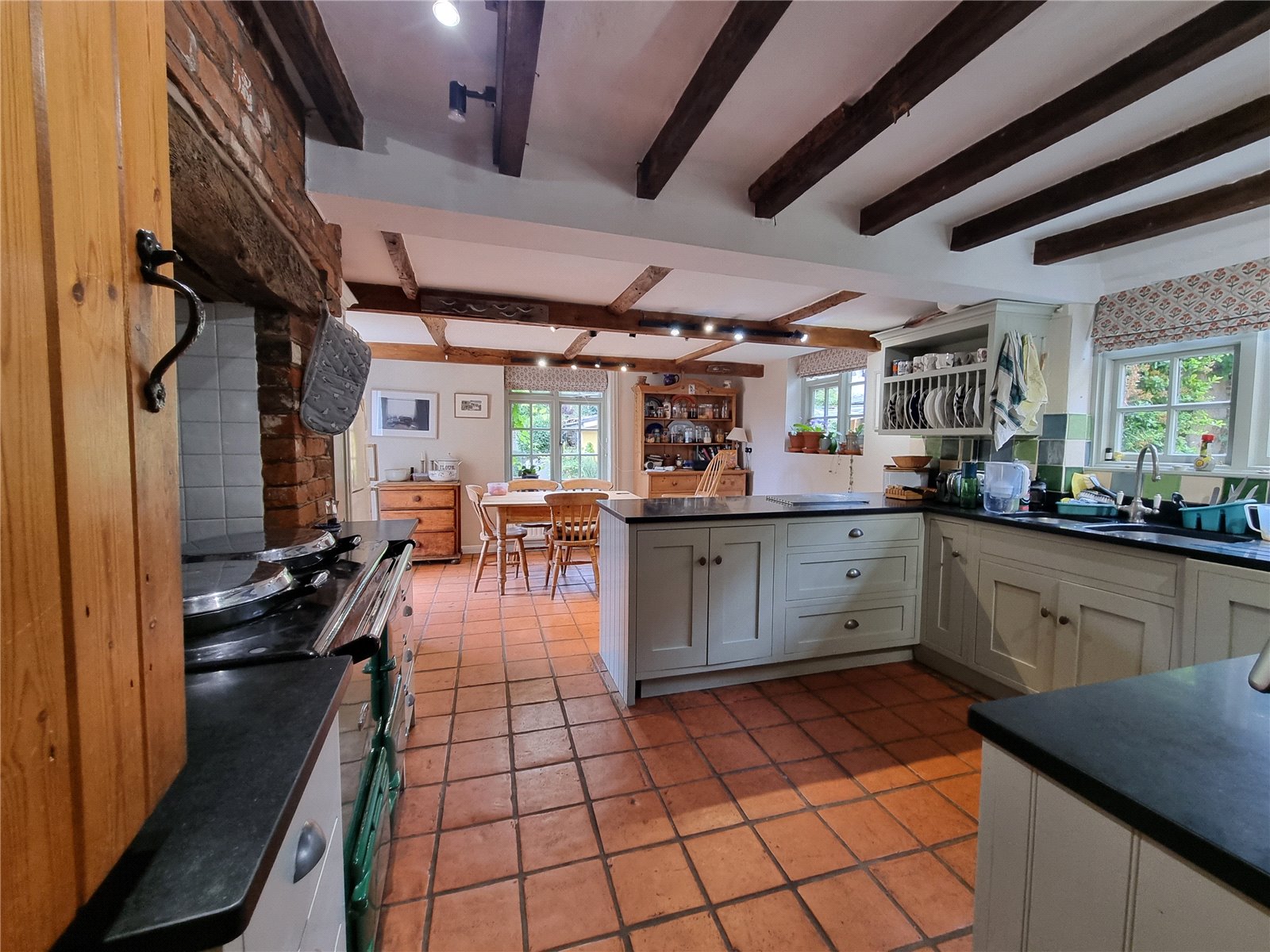 From here, an inner hallway provides access to the side courtyard. To the rear lies a study with French doors to the patio and views across the side garden. The kitchen/breakfast room is a spacious and inviting area, offering generous storage, a gas-fired AGA, room for a large dining table, and doors that open directly onto the garden.