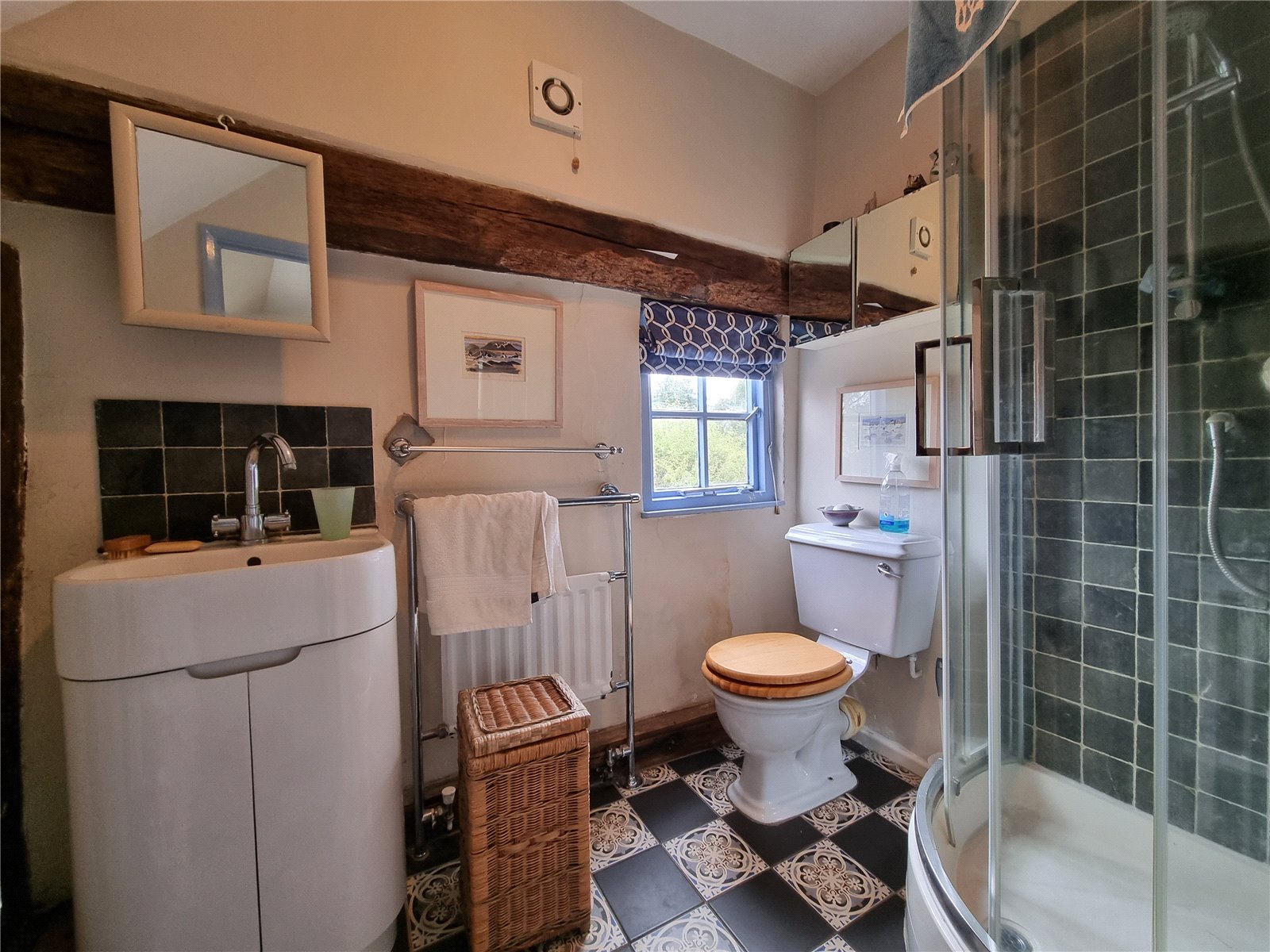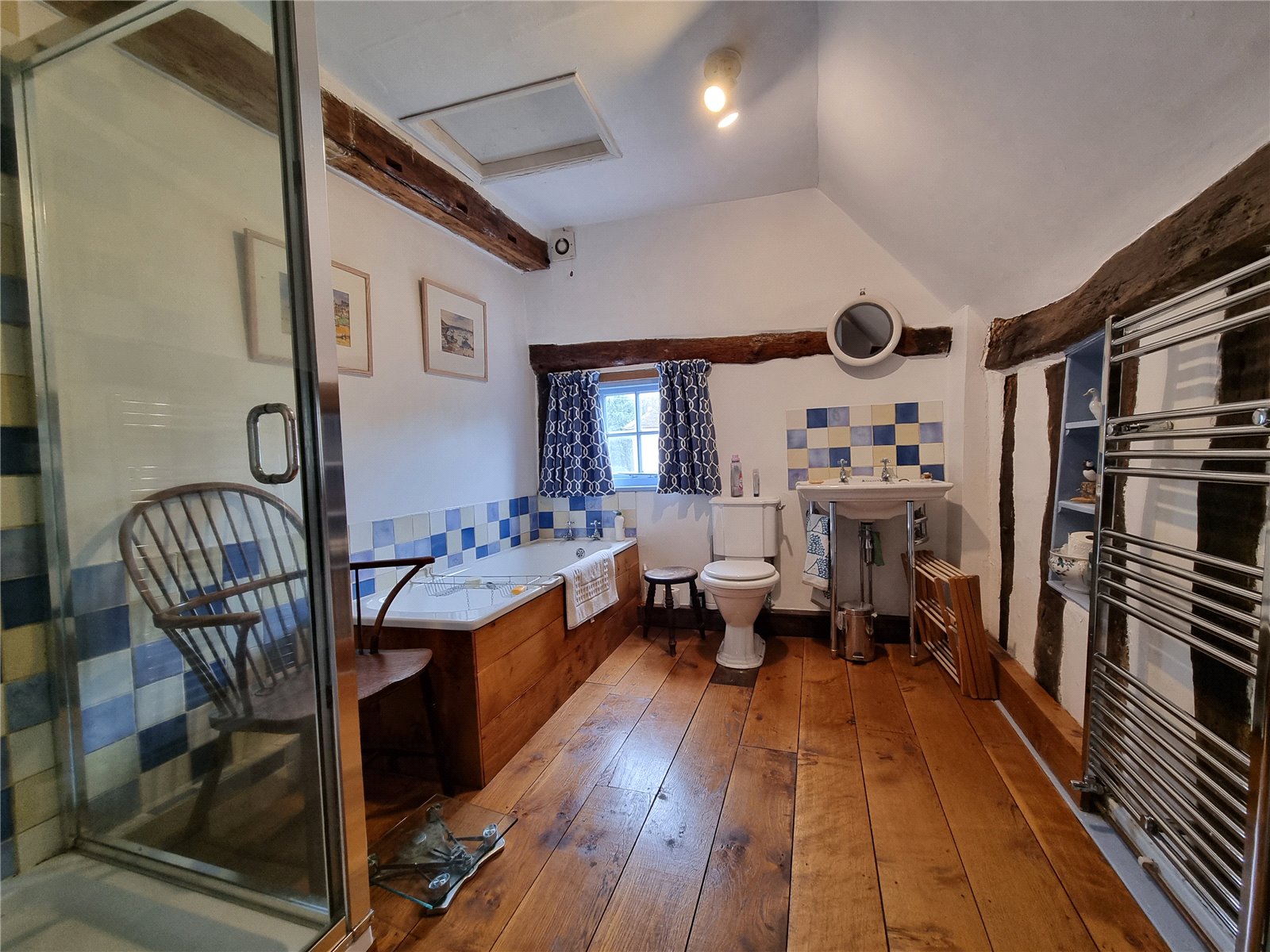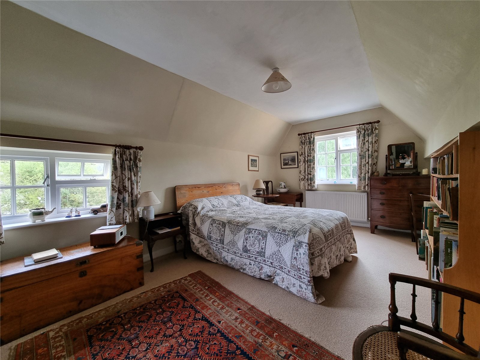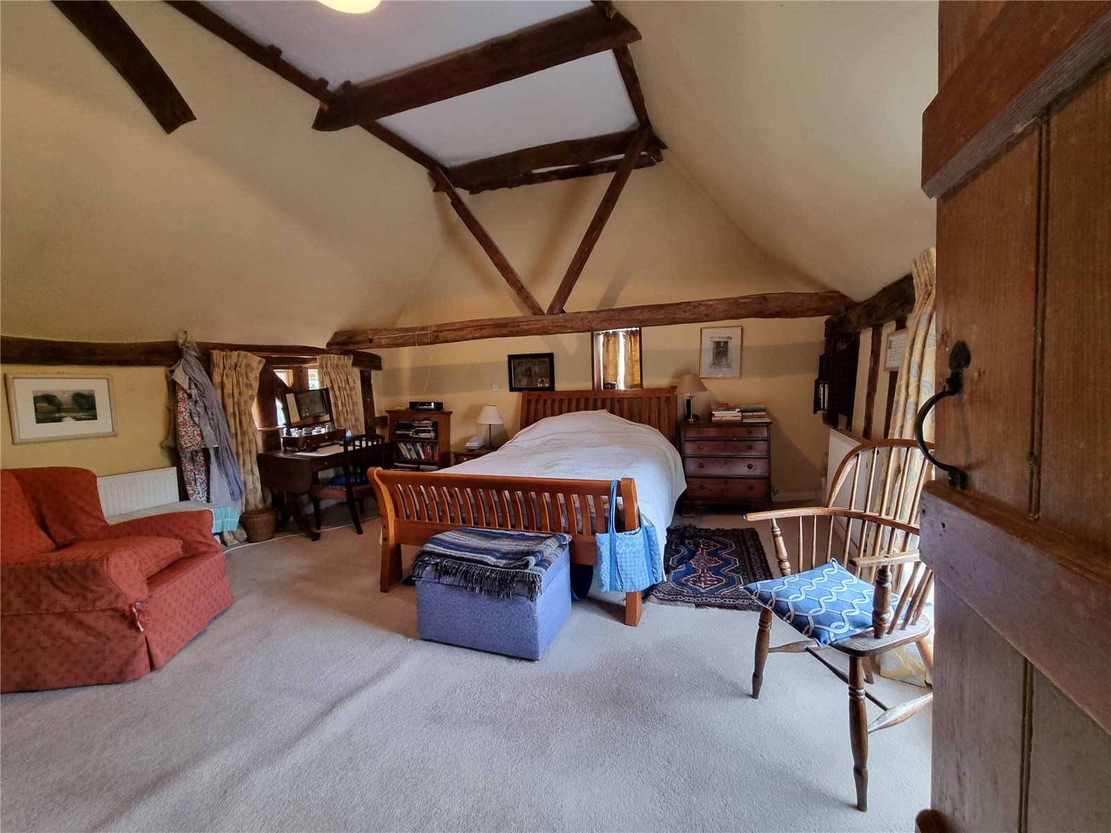 There are three double bedrooms and an ample single, including a magnificent principal suite spanning the full width of the front of the house. This room boasts a vaulted ceiling, exposed chimney, dressing room, and en-suite shower room. The remaining bedrooms are set to the rear, two of which enjoy views over the garden, and are served by a spacious family bathroom with both bath and separate shower.