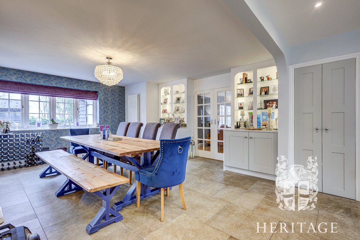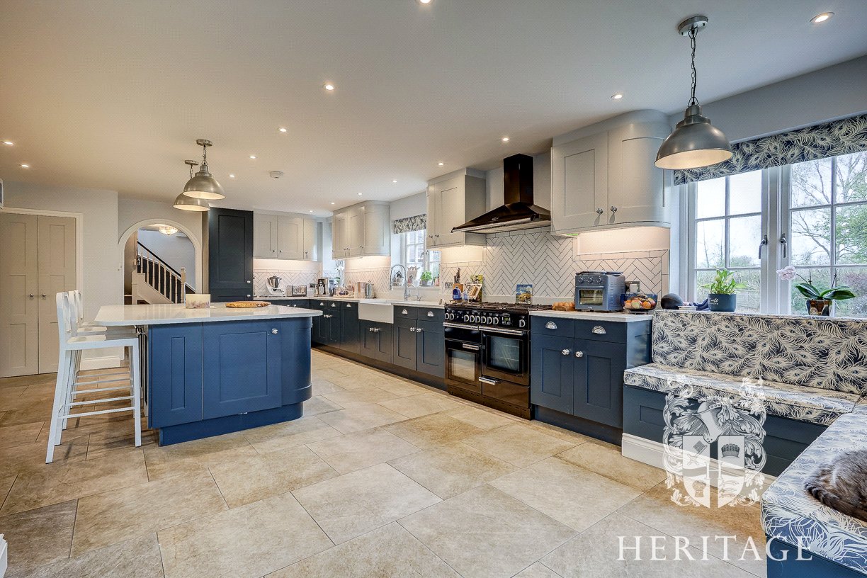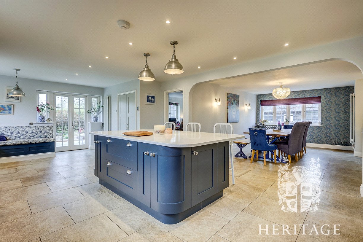 Moving through, the heart of the home is the kitchen/breakfast room, a well-designed space ideal for modern family life. There is ample room for dining, with a central island and a natural flow into the adjoining dining area, creating a sociable environment for both day-to-day use and entertaining.
