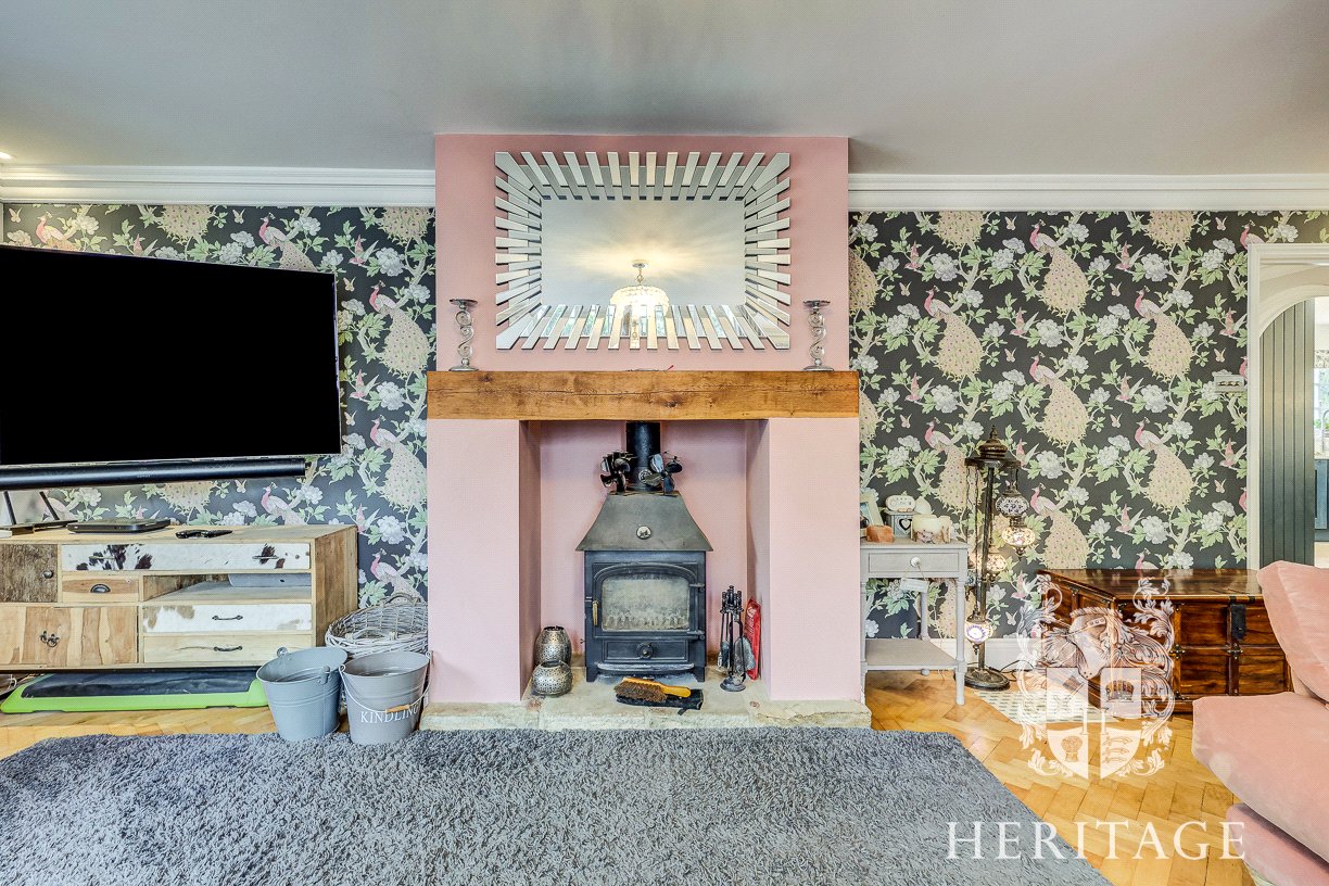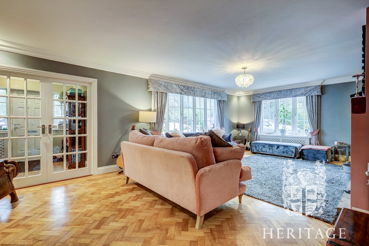 To the front, the sitting room is a particularly impressive space with a beautiful parquet floor and fireplace. Offering generous proportions and a comfortable setting for everyday living, with excellent natural light.