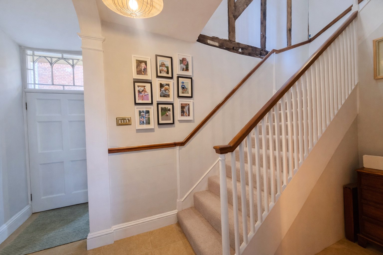 The inner hallway is particularly attractive, featuring a wide, sweeping staircase that rises gracefully to a galleried landing.