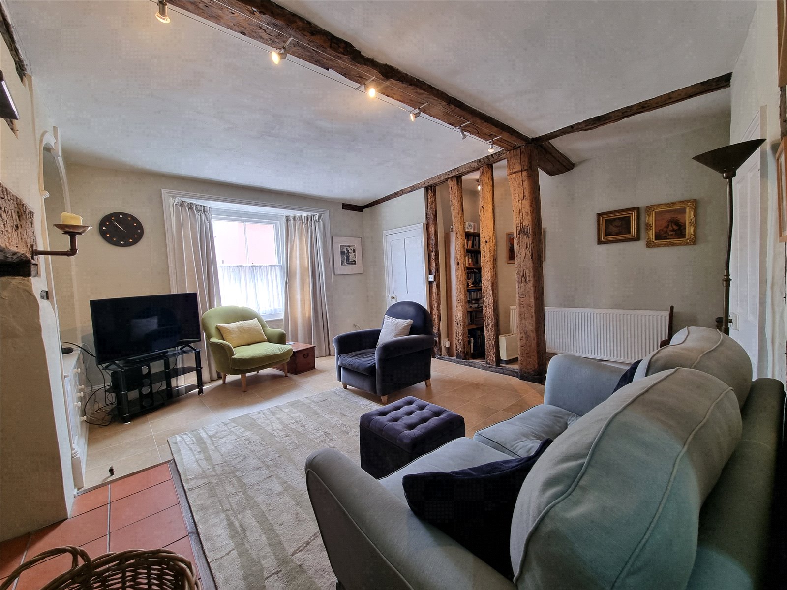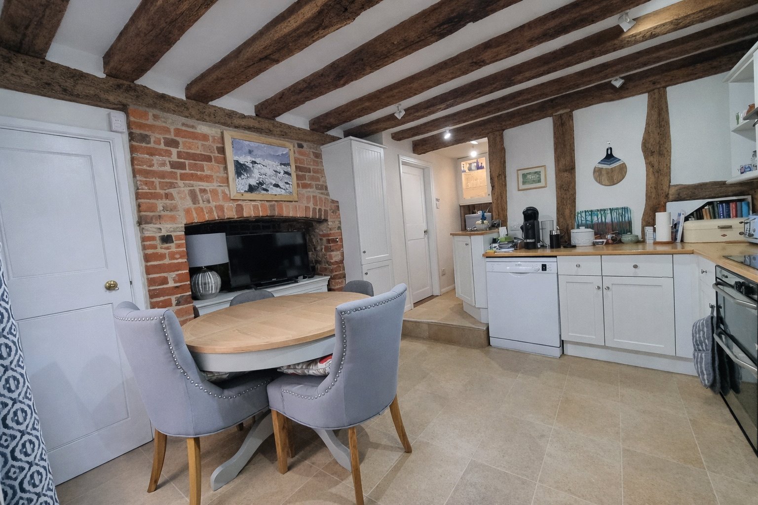 Inside, you’re welcomed by a small porch that opens into a beautifully proportioned sitting room, complete with high ceilings, a striking inglenook fireplace with wood burner, and the original bay window flooding the room with natural light. Exposed studwork subtly separates a useful study or storage area, which was once a corridor leading from the main entrance.